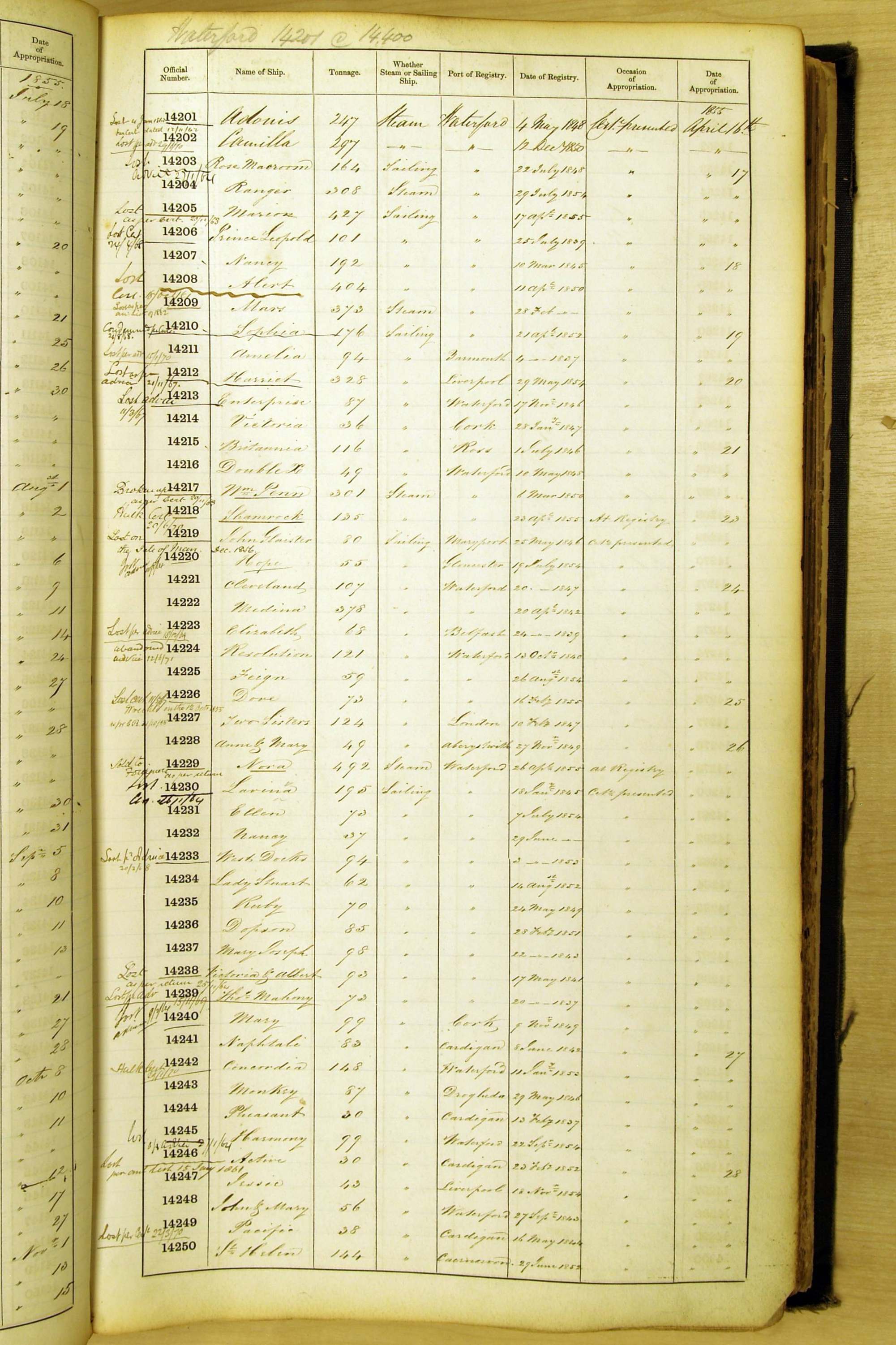 Bear in mind that the ships names in the Appropriation Books are not the definitive name or spelling of the name, even though these are the central records for the whole system. As you can see, the entries are hand-written and derived from hand-written returns made by the various ports, themselves based on the hand-written shipping registers, based on what the port officials thought the person registering the ship was saying or had hand-written down.