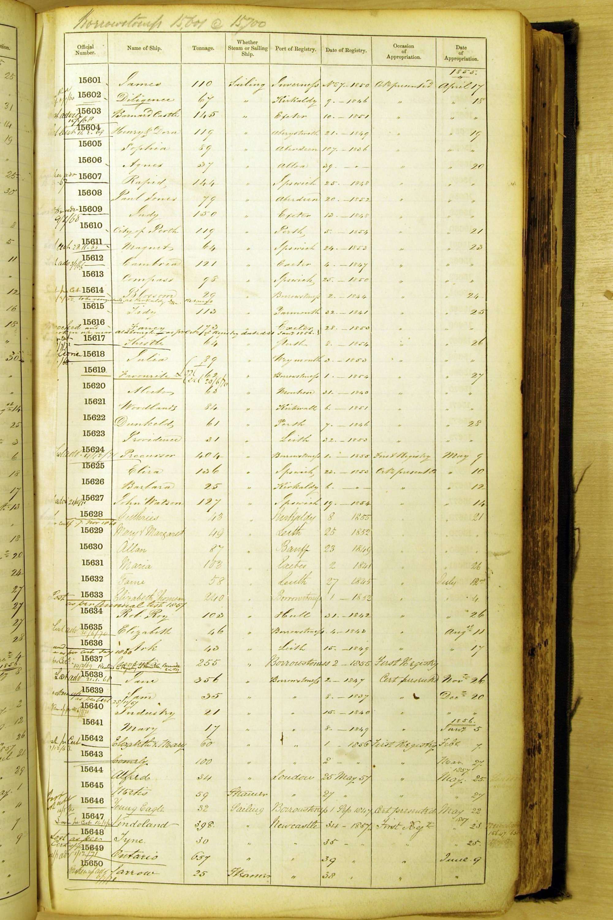Bear in mind that the ships names in the Appropriation Books are not the definitive name or spelling of the name, even though these are the central records for the whole system. As you can see, the entries are hand-written and derived from hand-written returns made by the various ports, themselves based on the hand-written shipping registers, based on what the port officials thought the person registering the ship was saying or had hand-written down.