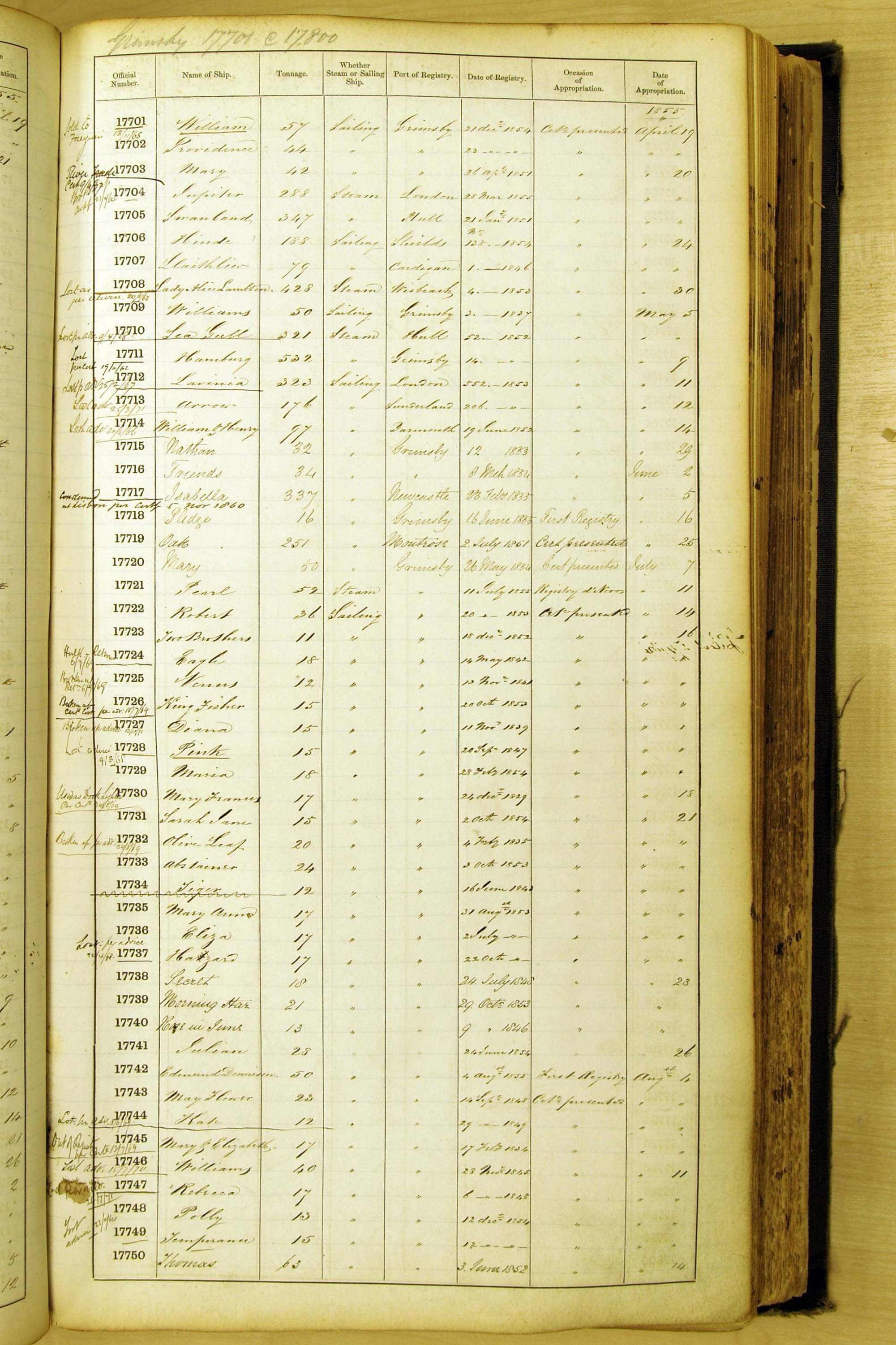 Especially in the first volume, there are frequent margin annotations against the entries which (if you can decipher them) can provide information on the ultimate fate of the ship. Typical entries are 'Lost as per cert[ificate] 20/6/58' or 'Sold foreigners per advice 8/4/67'. Beware - it is sometimes not easy to see which entry it refers to. However, these annotations may be a useful quick alternative to consulting the original Shipping Registers.