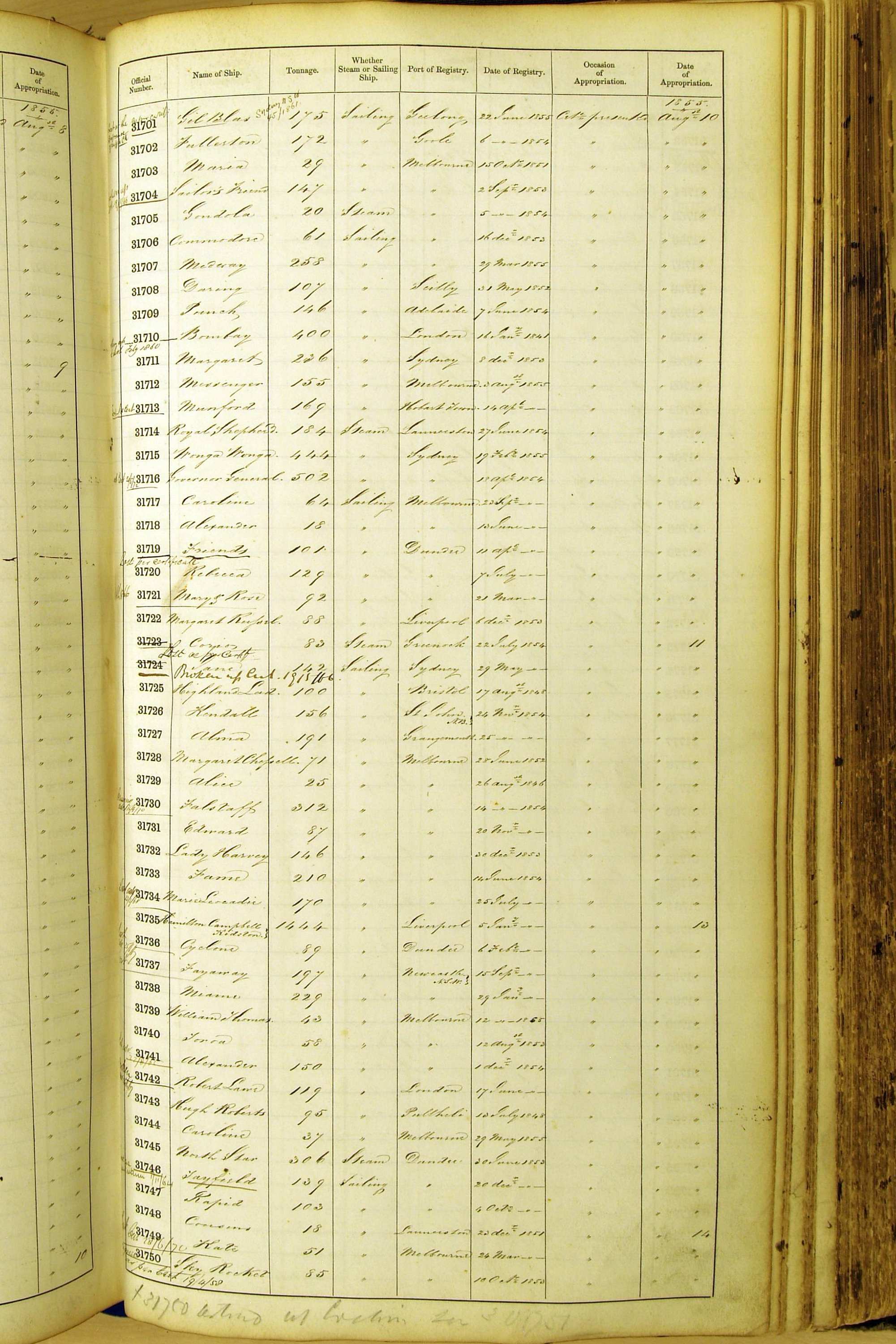 Especially in the first volume, there are frequent margin annotations against the entries which (if you can decipher them) can provide information on the ultimate fate of the ship. Typical entries are 'Lost as per cert[ificate] 20/6/58' or 'Sold foreigners per advice 8/4/67'. Beware - it is sometimes not easy to see which entry it refers to. However, these annotations may be a useful quick alternative to consulting the original Shipping Registers.