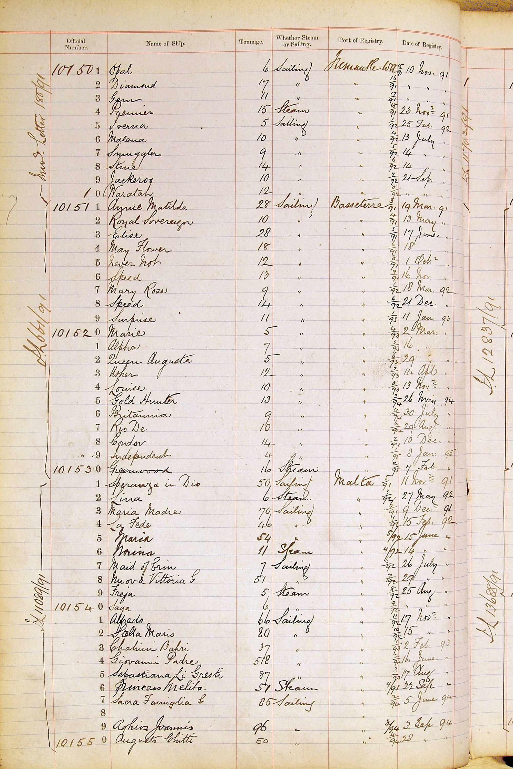 When the system of official numbers began on 16 April 1855, the British Ports of Registry were each allocated batches of official numbers. For official numbers up to 22200 you can see this allocation as a pencil note at the top of the page where the allocation began. A summary of the first allocation is shown here: Initial allocation of official numbers