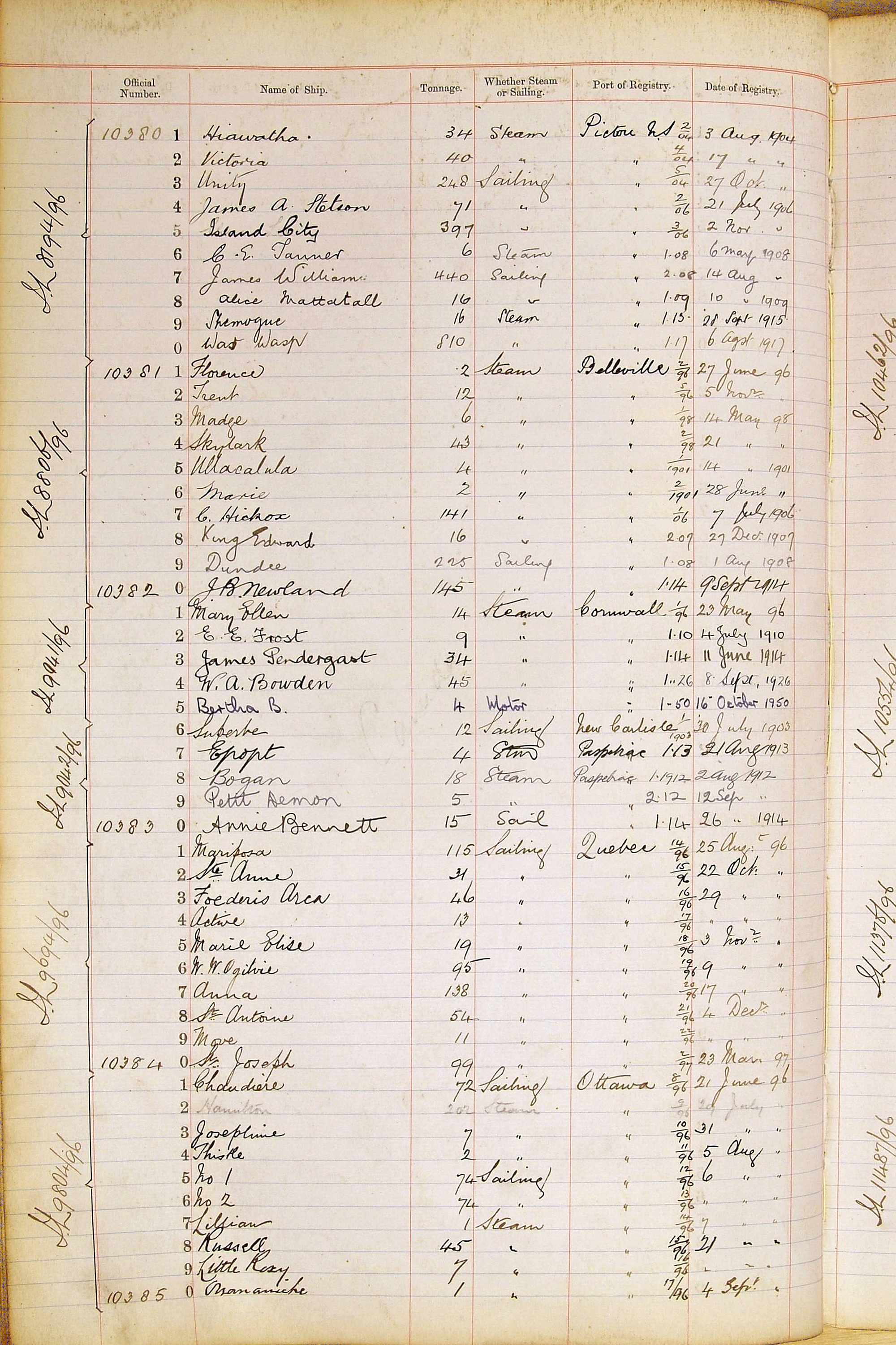 When the system of official numbers began on 16 April 1855, the British Ports of Registry were each allocated batches of official numbers. For official numbers up to 22200 you can see this allocation as a pencil note at the top of the page where the allocation began. A summary of the first allocation is shown here: Initial allocation of official numbers