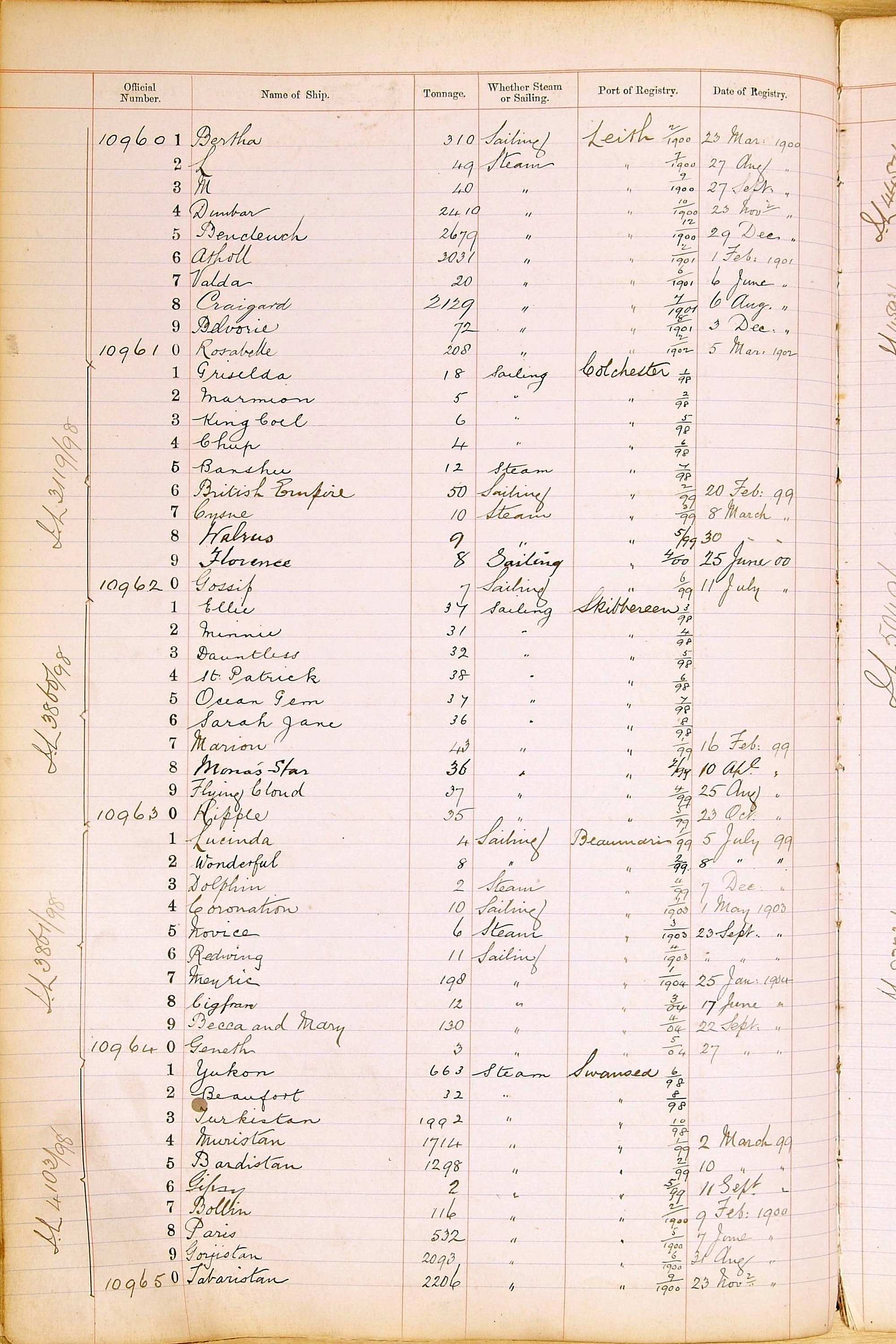 When the system of official numbers began on 16 April 1855, the British Ports of Registry were each allocated batches of official numbers. For official numbers up to 22200 you can see this allocation as a pencil note at the top of the page where the allocation began. A summary of the first allocation is shown here: Initial allocation of official numbers