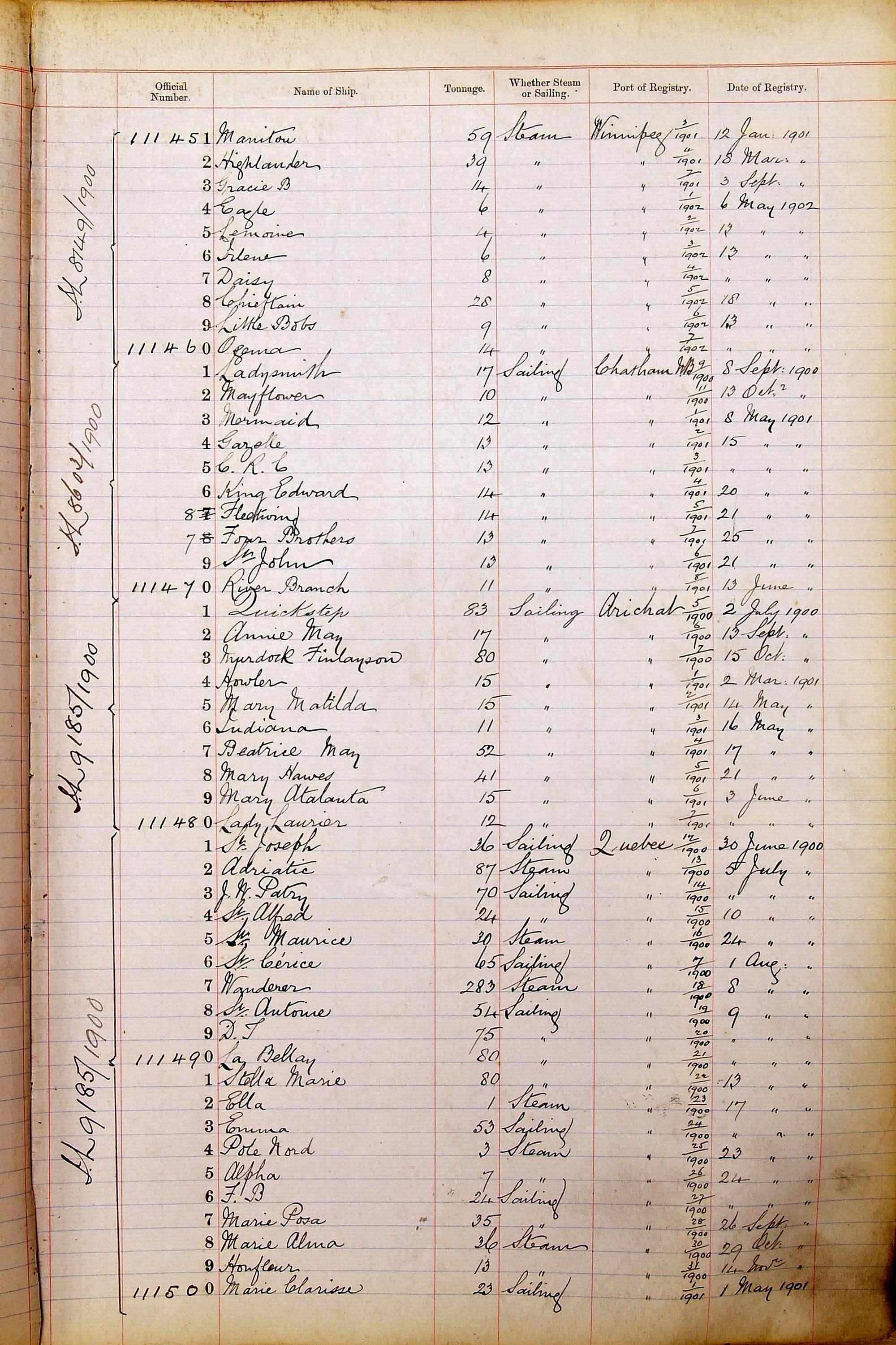 The ship names recorded are those that the ships carried at the time that their official numbers were allocated - changes are sometimes noted, but the best source for changes of name are the shipping registers for the port, or alternatively the Mercantile Navy List.