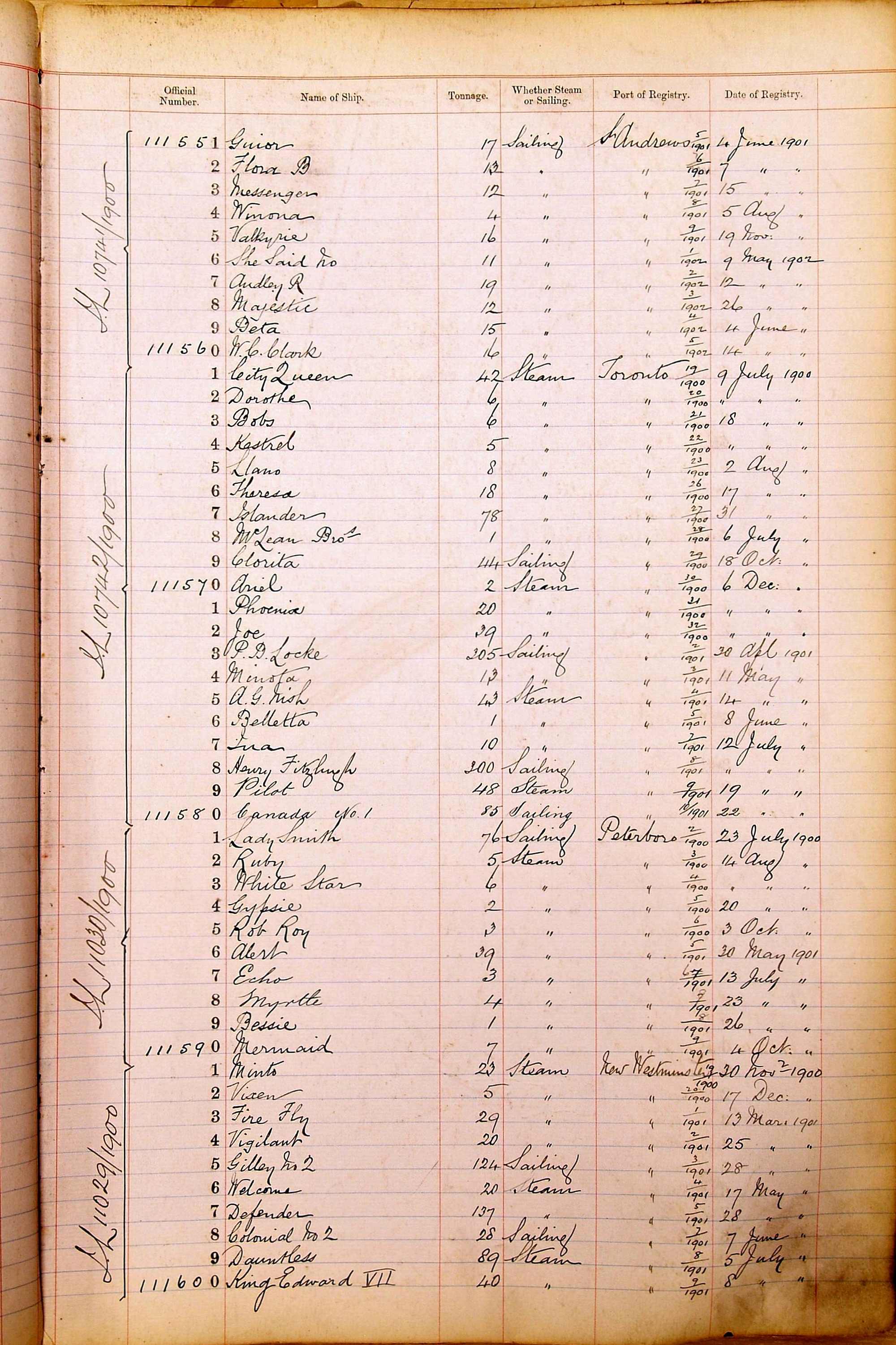 When the system of official numbers began on 16 April 1855, the British Ports of Registry were each allocated batches of official numbers. For official numbers up to 22200 you can see this allocation as a pencil note at the top of the page where the allocation began. A summary of the first allocation is shown here: Initial allocation of official numbers
