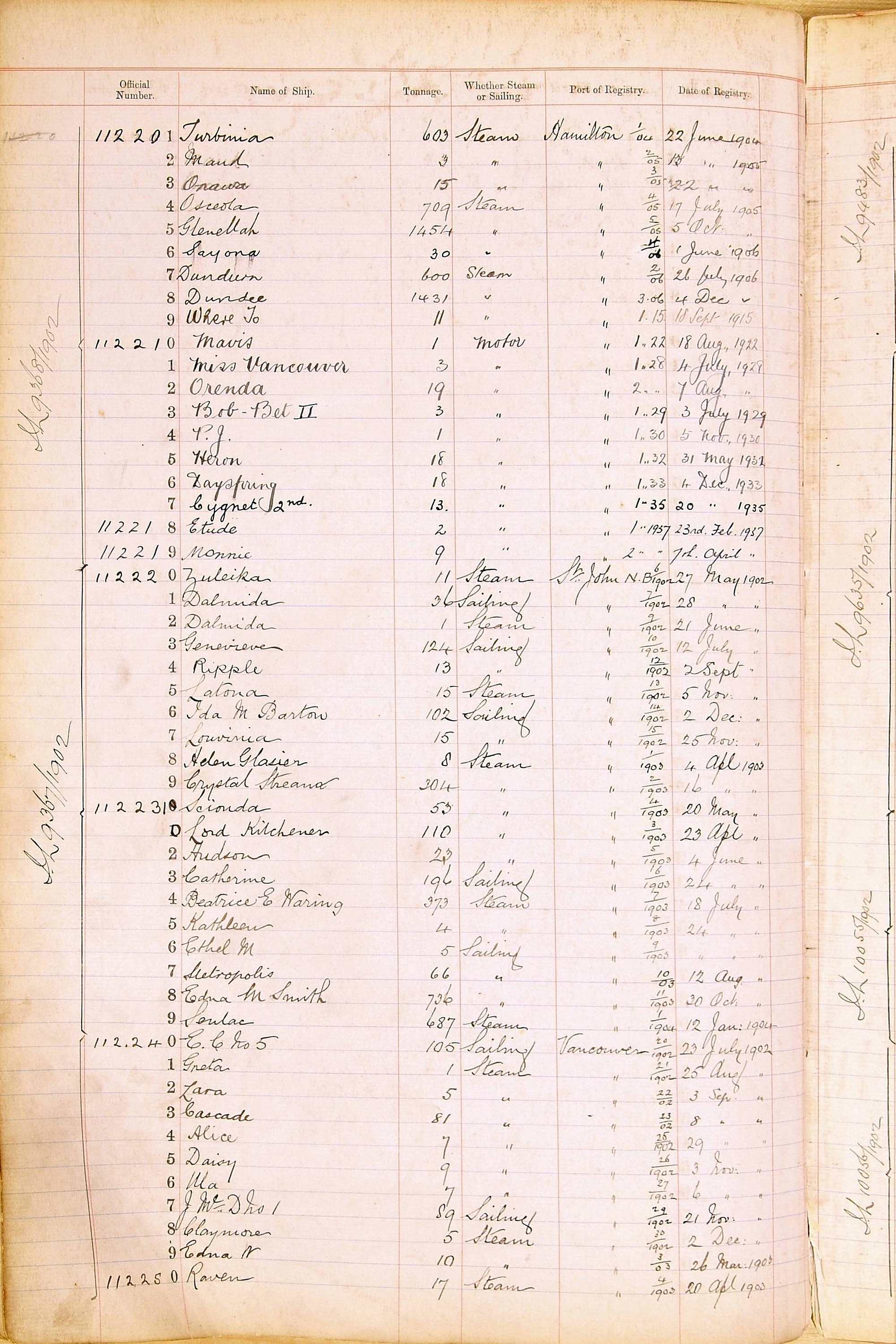 When the system of official numbers began on 16 April 1855, the British Ports of Registry were each allocated batches of official numbers. For official numbers up to 22200 you can see this allocation as a pencil note at the top of the page where the allocation began. A summary of the first allocation is shown here: Initial allocation of official numbers