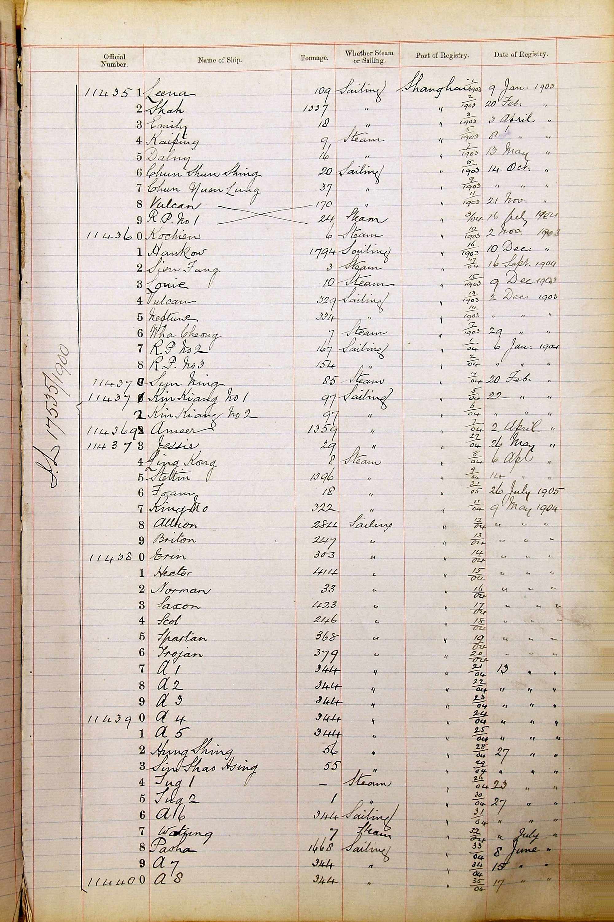 When the system of official numbers began on 16 April 1855, the British Ports of Registry were each allocated batches of official numbers. For official numbers up to 22200 you can see this allocation as a pencil note at the top of the page where the allocation began. A summary of the first allocation is shown here: Initial allocation of official numbers