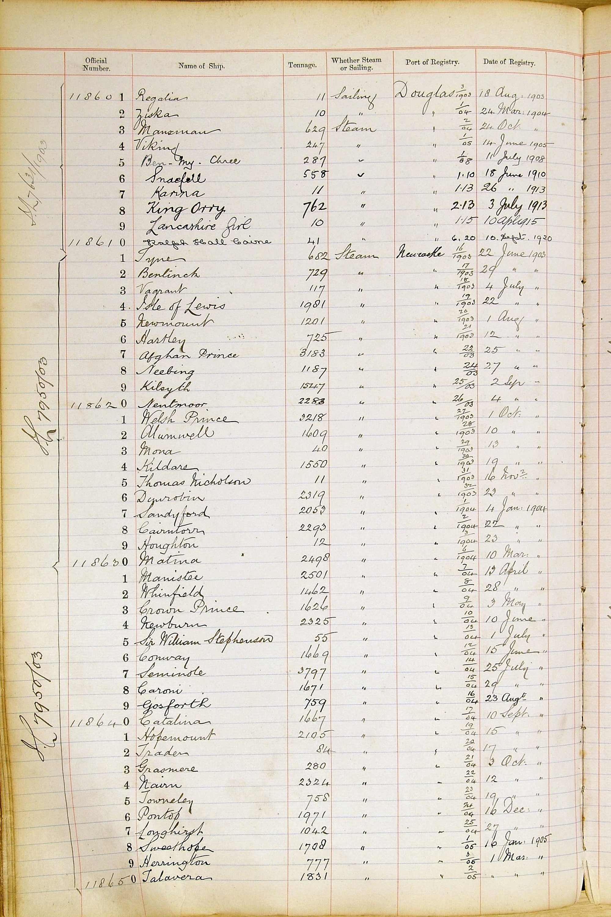 When the system of official numbers began on 16 April 1855, the British Ports of Registry were each allocated batches of official numbers. For official numbers up to 22200 you can see this allocation as a pencil note at the top of the page where the allocation began. A summary of the first allocation is shown here: Initial allocation of official numbers