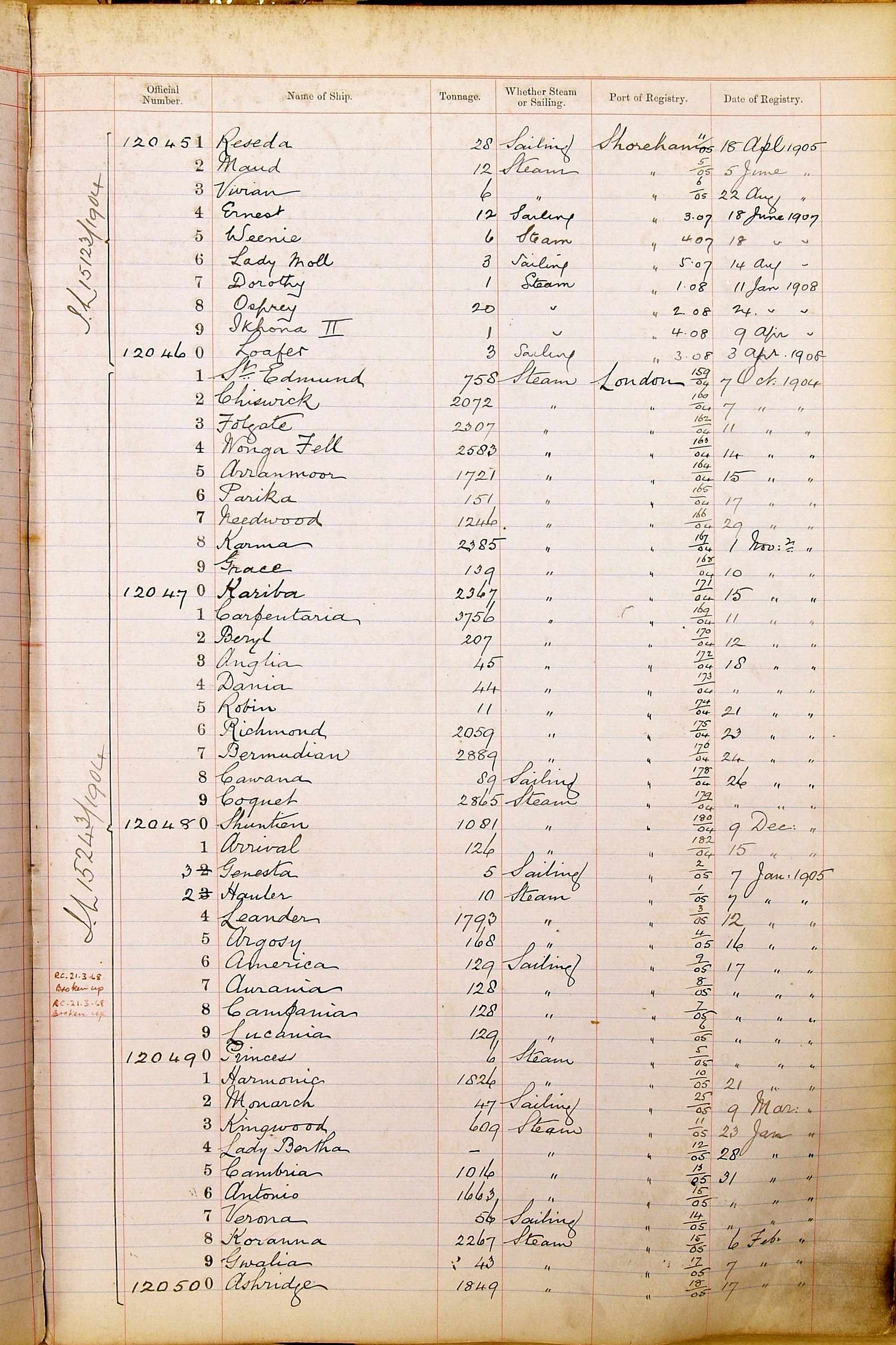 When the system of official numbers began on 16 April 1855, the British Ports of Registry were each allocated batches of official numbers. For official numbers up to 22200 you can see this allocation as a pencil note at the top of the page where the allocation began. A summary of the first allocation is shown here: Initial allocation of official numbers