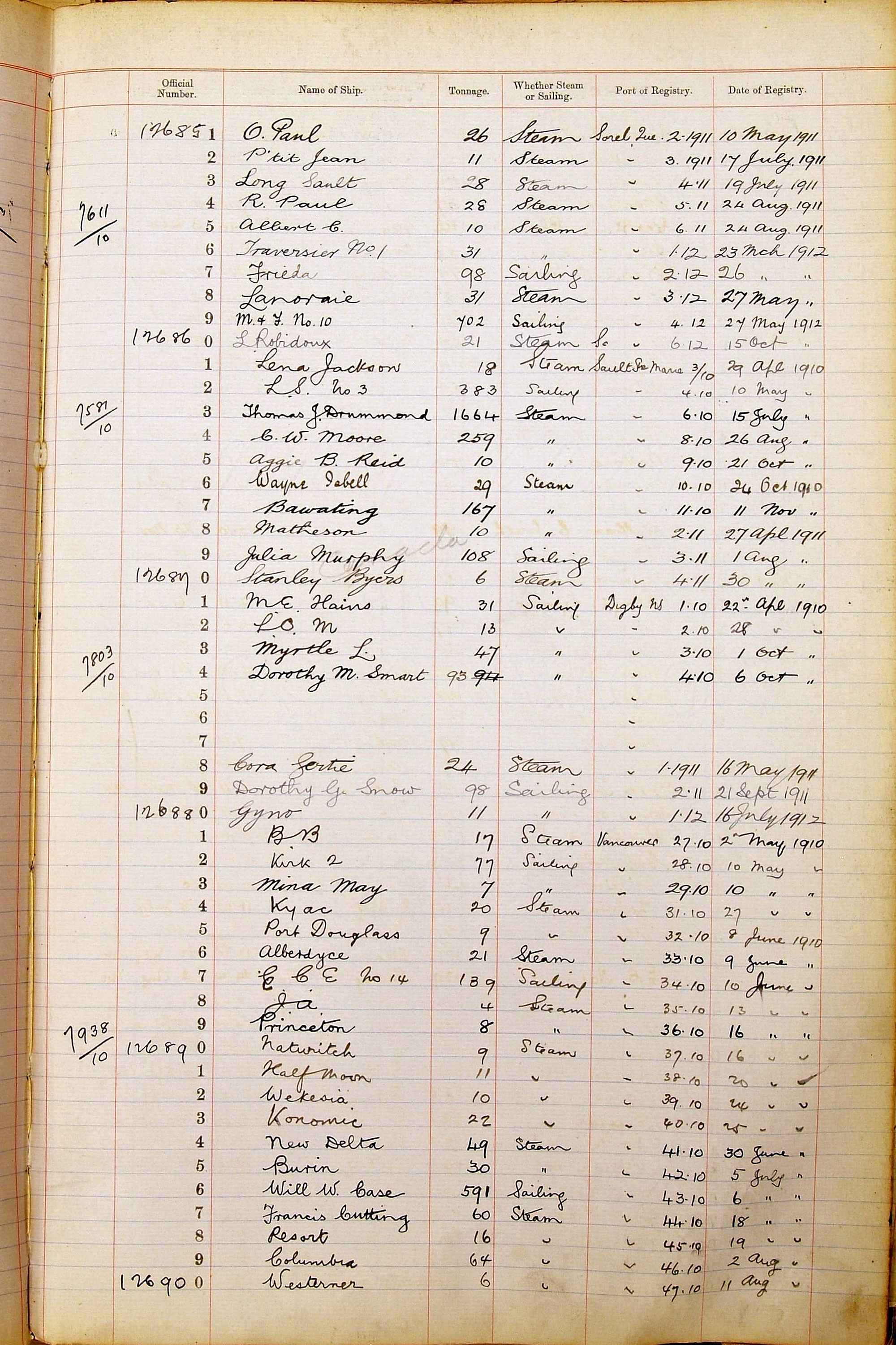 When the system of official numbers began on 16 April 1855, the British Ports of Registry were each allocated batches of official numbers. For official numbers up to 22200 you can see this allocation as a pencil note at the top of the page where the allocation began. A summary of the first allocation is shown here: Initial allocation of official numbers