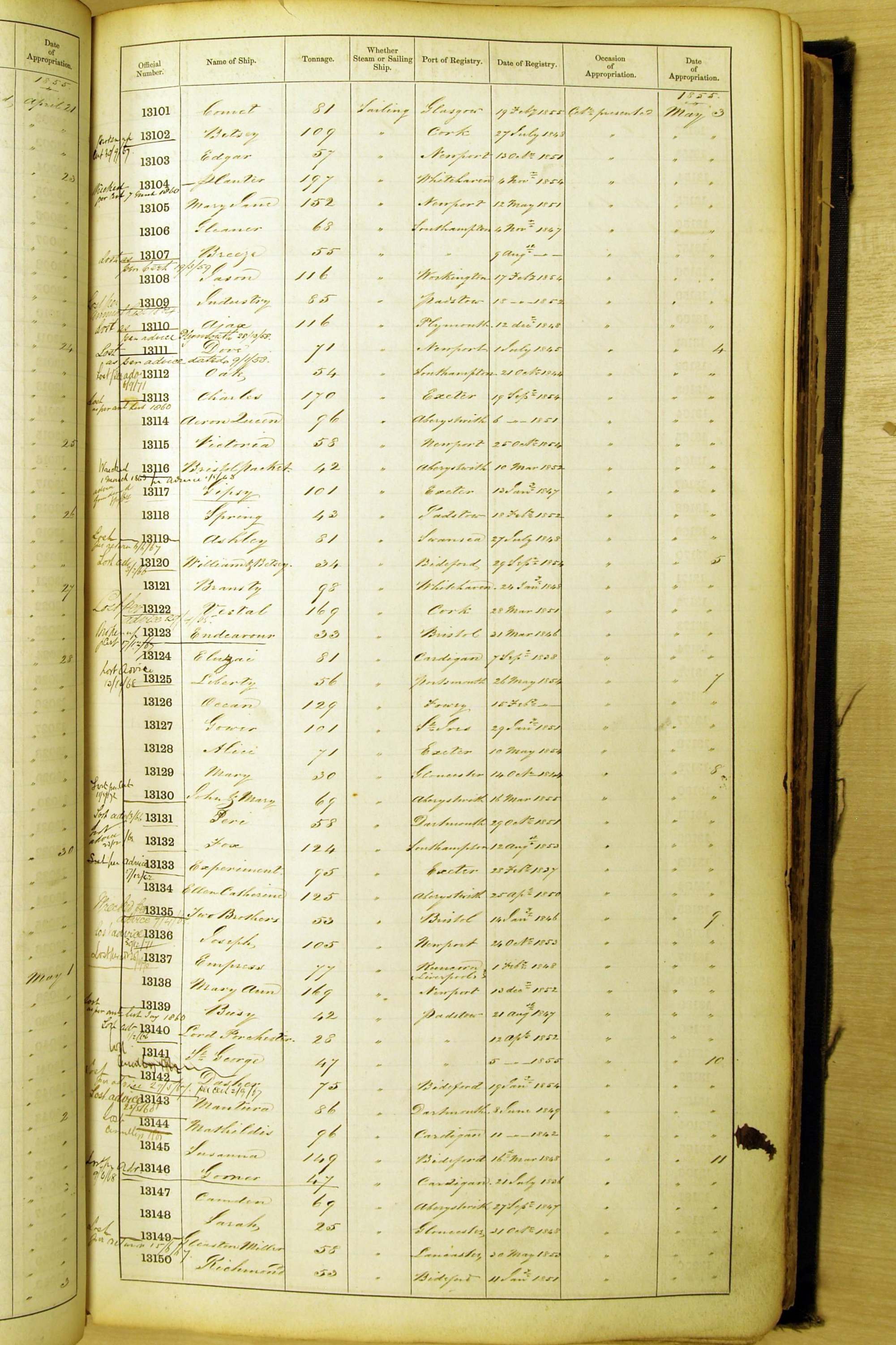 Bear in mind that the ships names in the Appropriation Books are not the definitive name or spelling of the name, even though these are the central records for the whole system. As you can see, the entries are hand-written and derived from hand-written returns made by the various ports, themselves based on the hand-written shipping registers, based on what the port officials thought the person registering the ship was saying or had hand-written down.