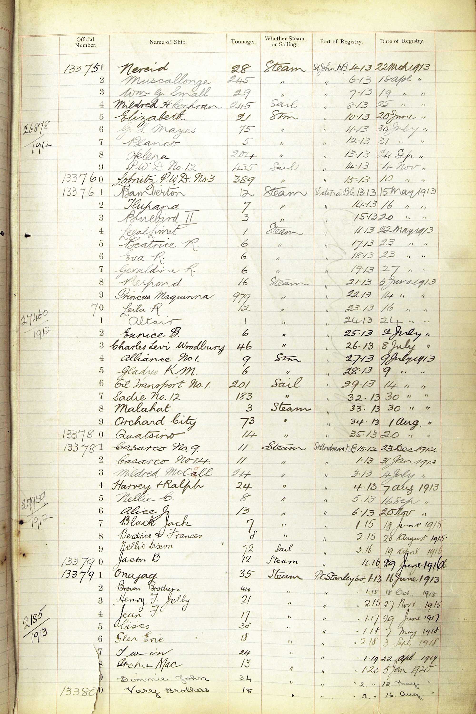 The ship names recorded are those that the ships carried at the time that their official numbers were allocated - changes are sometimes noted, but the best source for changes of name are the shipping registers for the port, or alternatively the Mercantile Navy List.