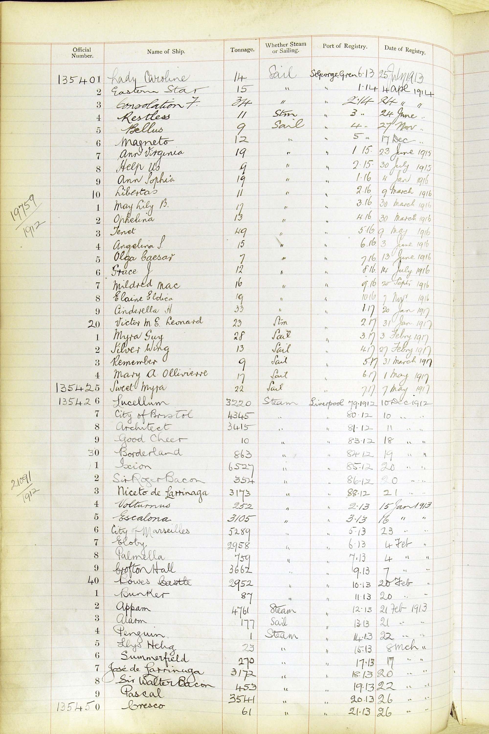When the system of official numbers began on 16 April 1855, the British Ports of Registry were each allocated batches of official numbers. For official numbers up to 22200 you can see this allocation as a pencil note at the top of the page where the allocation began. A summary of the first allocation is shown here: Initial allocation of official numbers