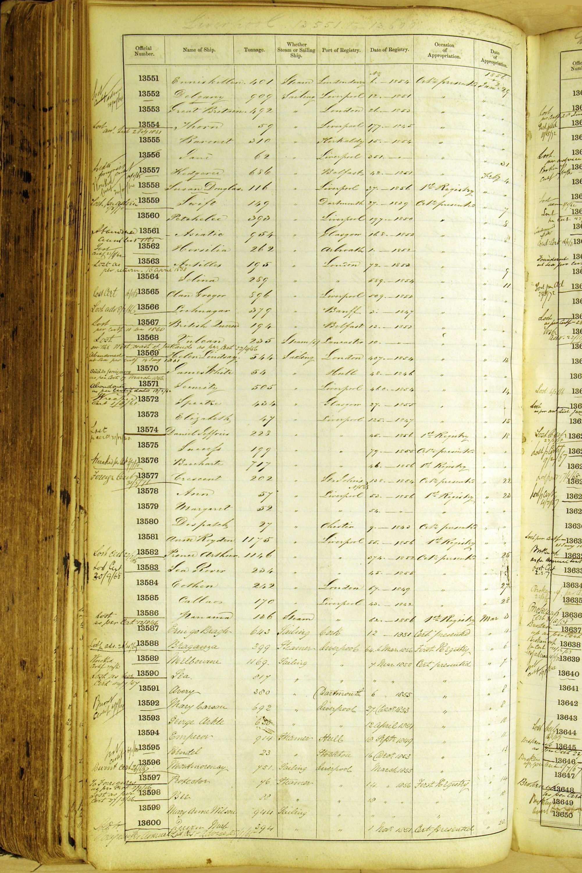 Especially in the first volume, there are frequent margin annotations against the entries which (if you can decipher them) can provide information on the ultimate fate of the ship. Typical entries are 'Lost as per cert[ificate] 20/6/58' or 'Sold foreigners per advice 8/4/67'. Beware - it is sometimes not easy to see which entry it refers to. However, these annotations may be a useful quick alternative to consulting the original Shipping Registers.