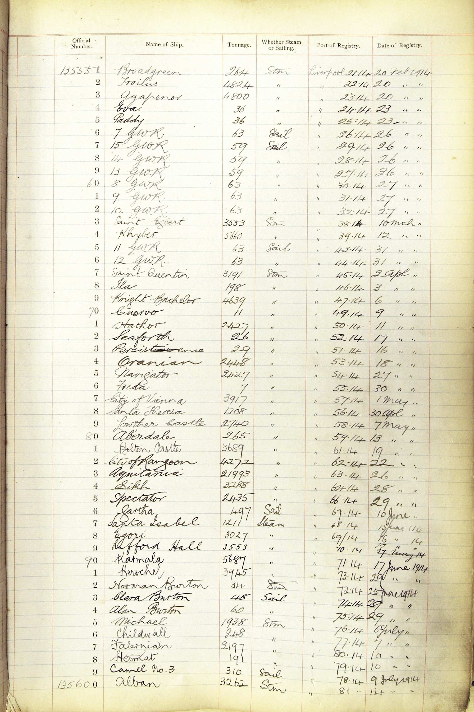 The ship names recorded are those that the ships carried at the time that their official numbers were allocated - changes are sometimes noted, but the best source for changes of name are the shipping registers for the port, or alternatively the Mercantile Navy List.