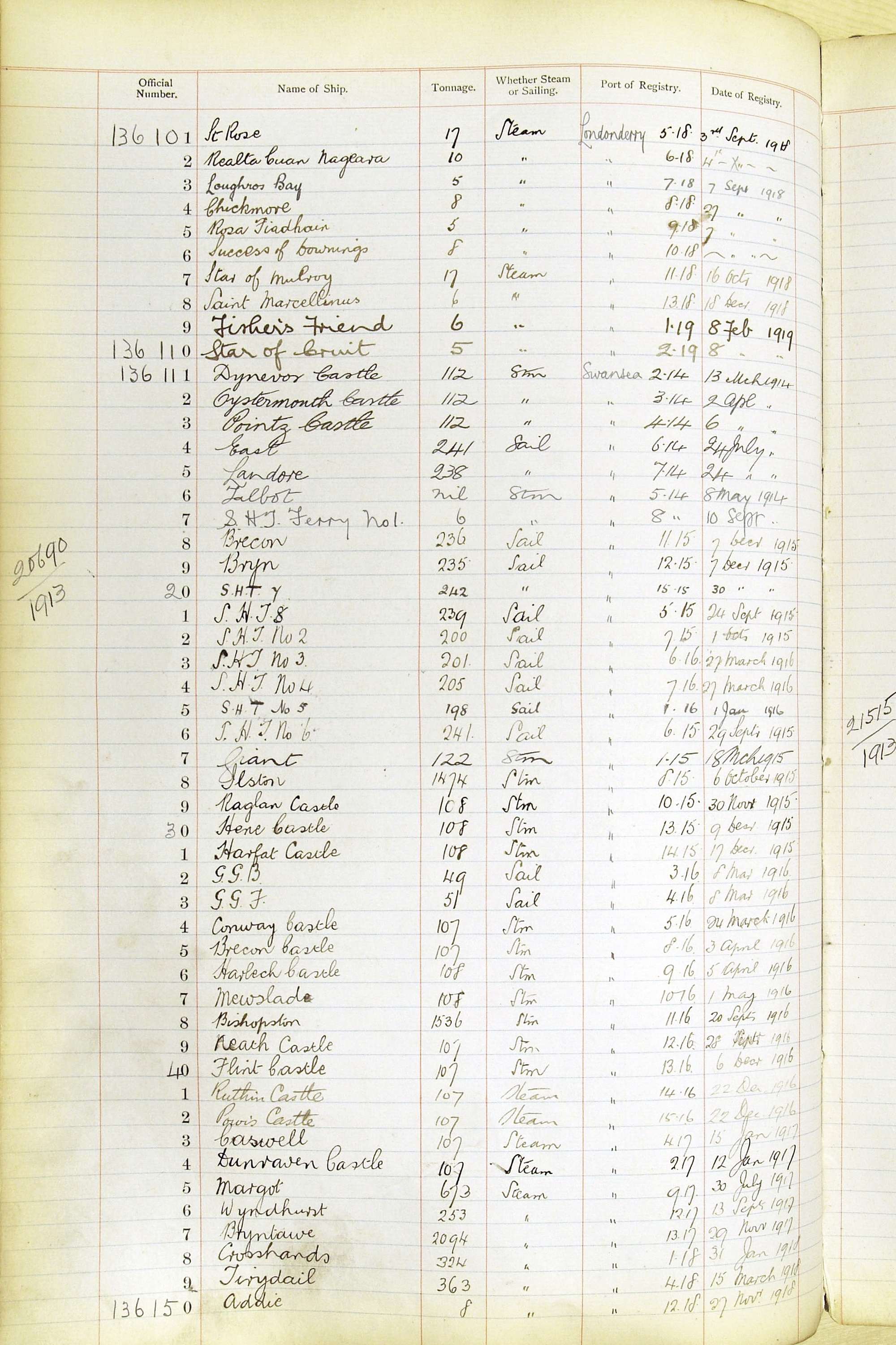 When the system of official numbers began on 16 April 1855, the British Ports of Registry were each allocated batches of official numbers. For official numbers up to 22200 you can see this allocation as a pencil note at the top of the page where the allocation began. A summary of the first allocation is shown here: Initial allocation of official numbers