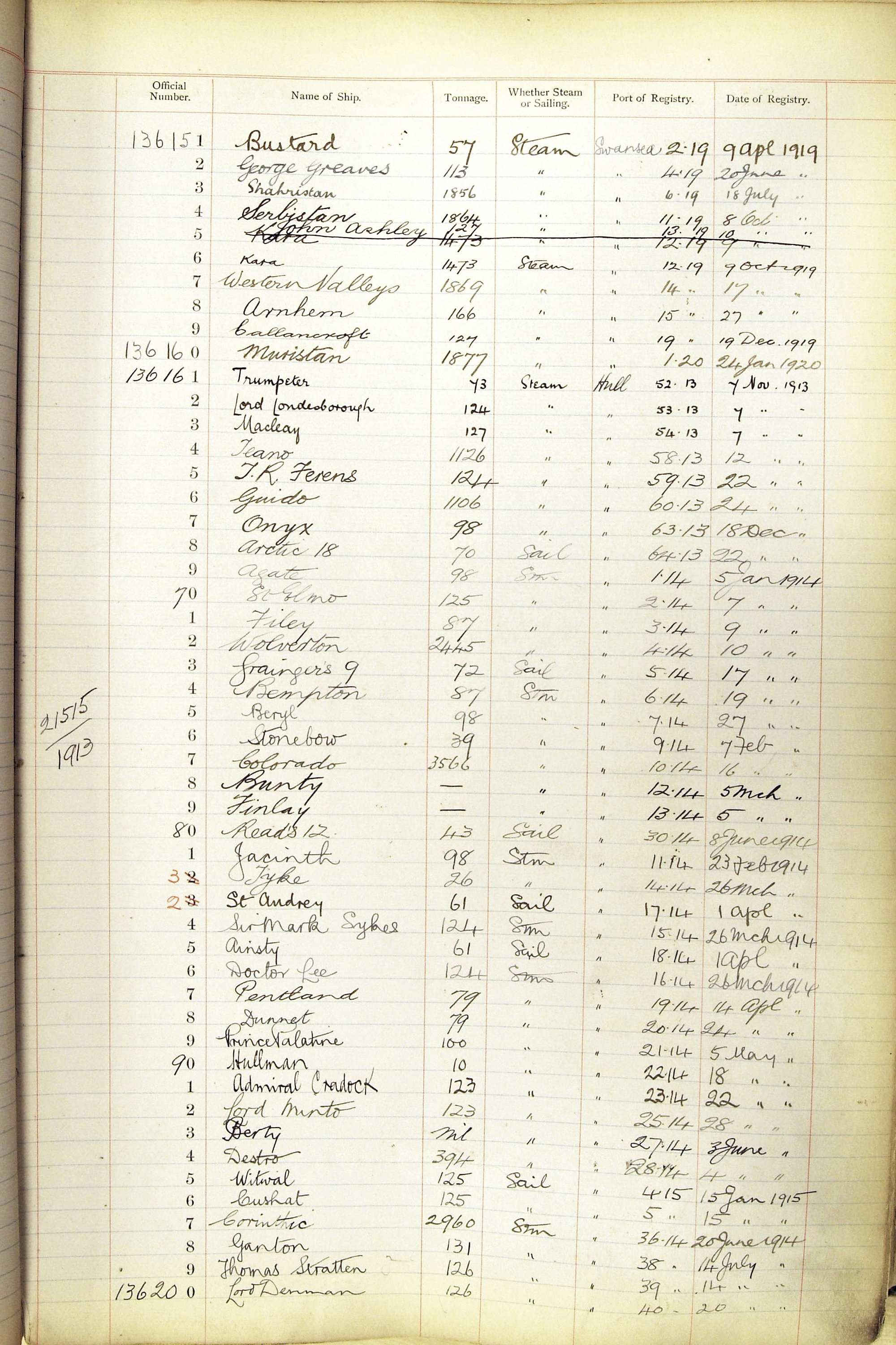 The ship names recorded are those that the ships carried at the time that their official numbers were allocated - changes are sometimes noted, but the best source for changes of name are the shipping registers for the port, or alternatively the Mercantile Navy List.