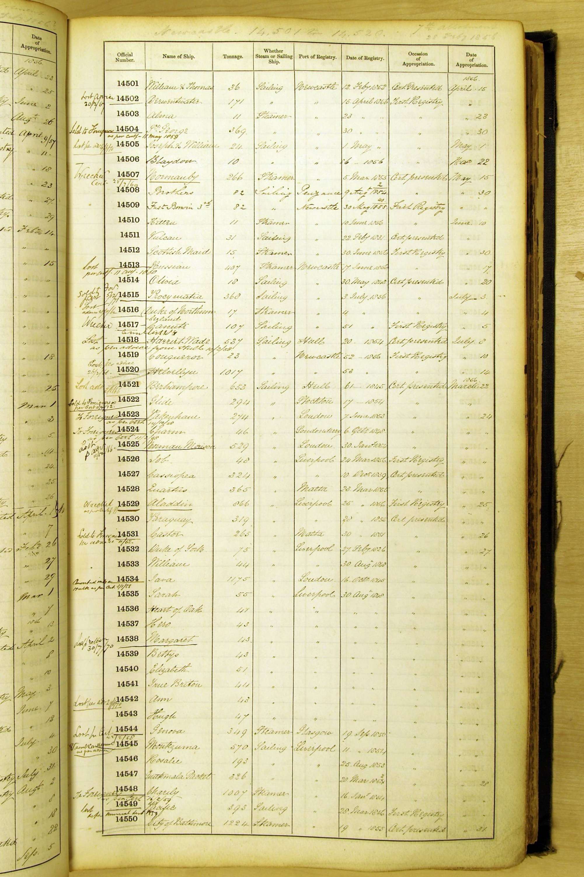 Especially in the first volume, there are frequent margin annotations against the entries which (if you can decipher them) can provide information on the ultimate fate of the ship. Typical entries are 'Lost as per cert[ificate] 20/6/58' or 'Sold foreigners per advice 8/4/67'. Beware - it is sometimes not easy to see which entry it refers to. However, these annotations may be a useful quick alternative to consulting the original Shipping Registers.