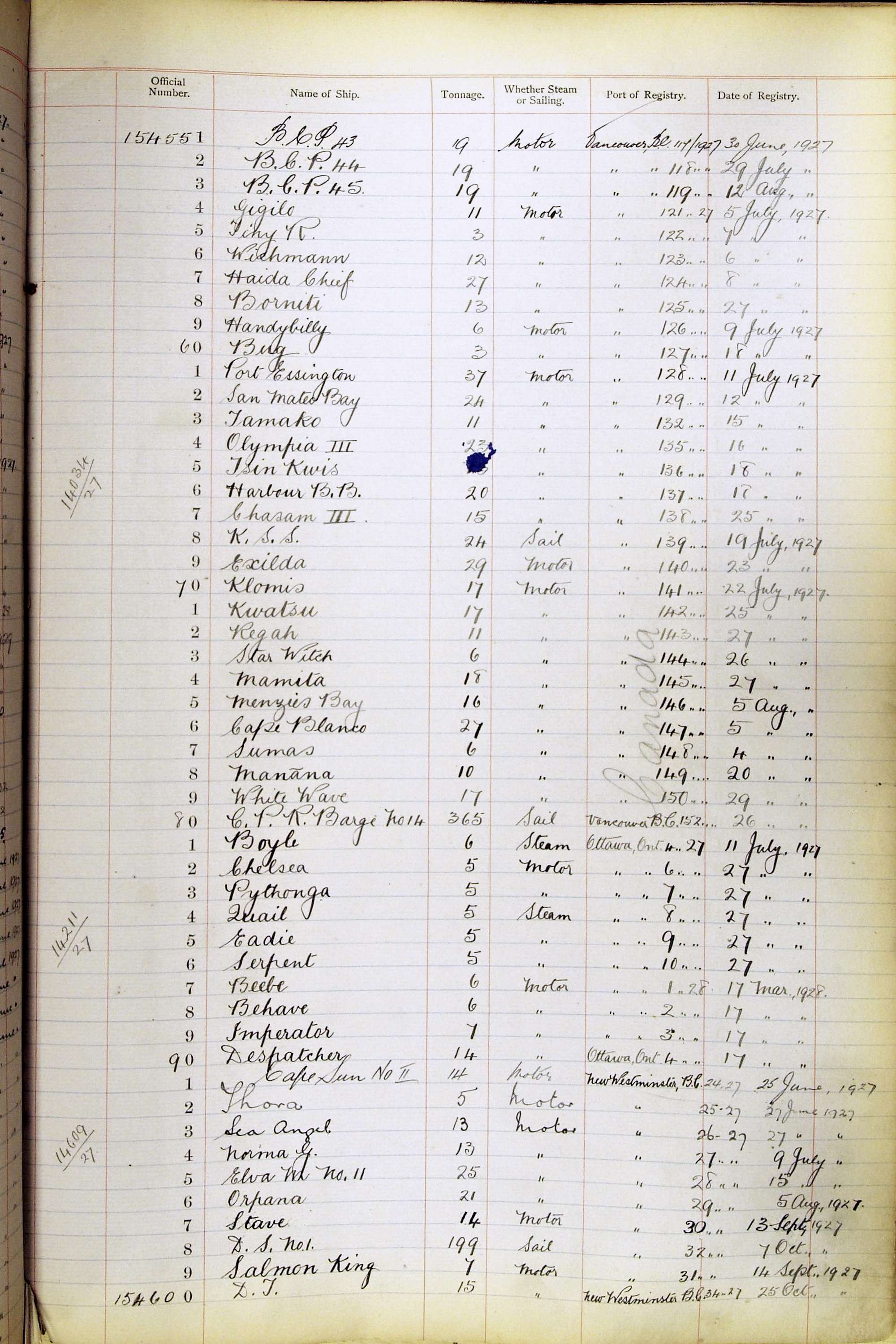 When the system of official numbers began on 16 April 1855, the British Ports of Registry were each allocated batches of official numbers. For official numbers up to 22200 you can see this allocation as a pencil note at the top of the page where the allocation began. A summary of the first allocation is shown here: Initial allocation of official numbers
