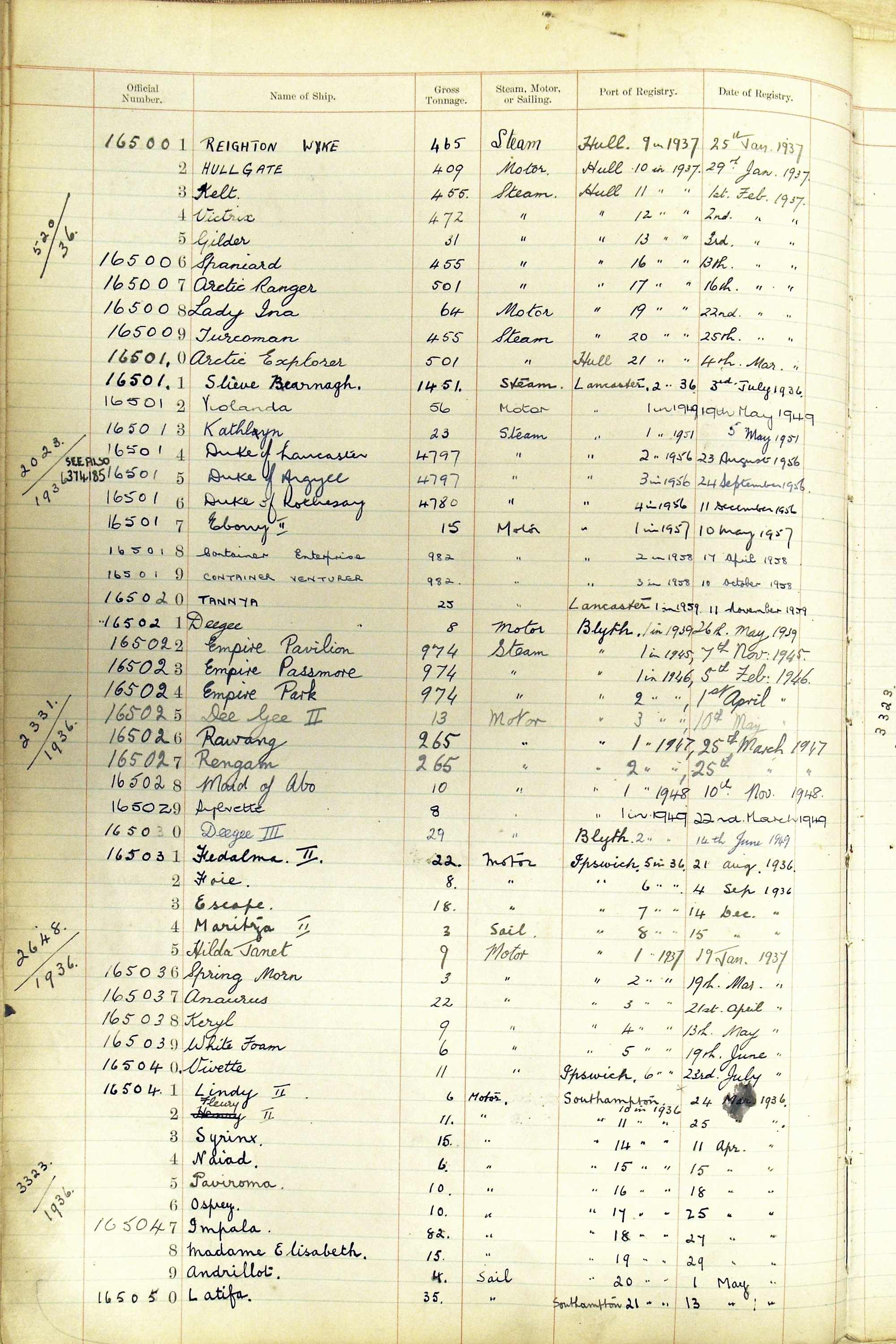 When the system of official numbers began on 16 April 1855, the British Ports of Registry were each allocated batches of official numbers. For official numbers up to 22200 you can see this allocation as a pencil note at the top of the page where the allocation began. A summary of the first allocation is shown here: Initial allocation of official numbers
