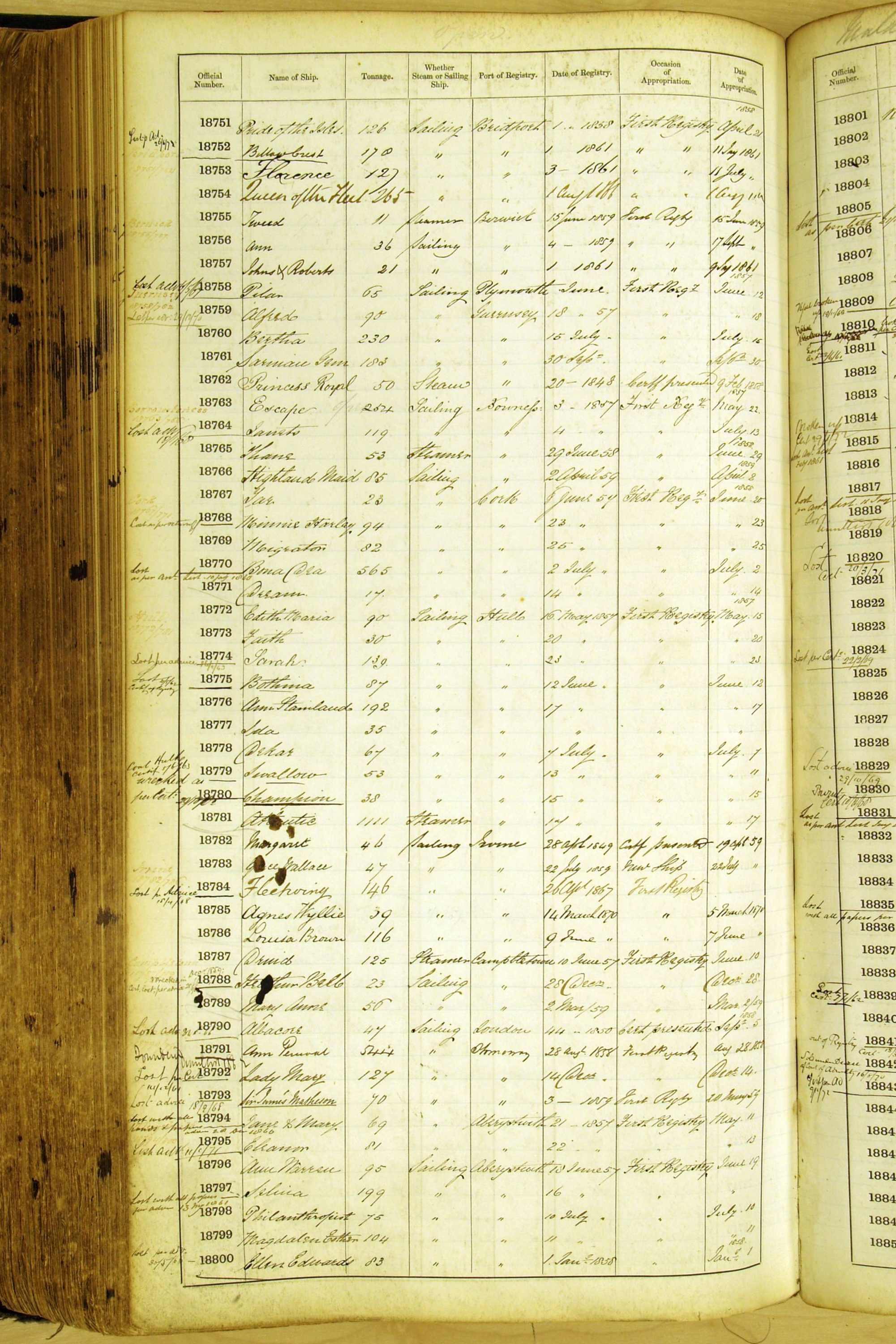 Especially in the first volume, there are frequent margin annotations against the entries which (if you can decipher them) can provide information on the ultimate fate of the ship. Typical entries are 'Lost as per cert[ificate] 20/6/58' or 'Sold foreigners per advice 8/4/67'. Beware - it is sometimes not easy to see which entry it refers to. However, these annotations may be a useful quick alternative to consulting the original Shipping Registers.