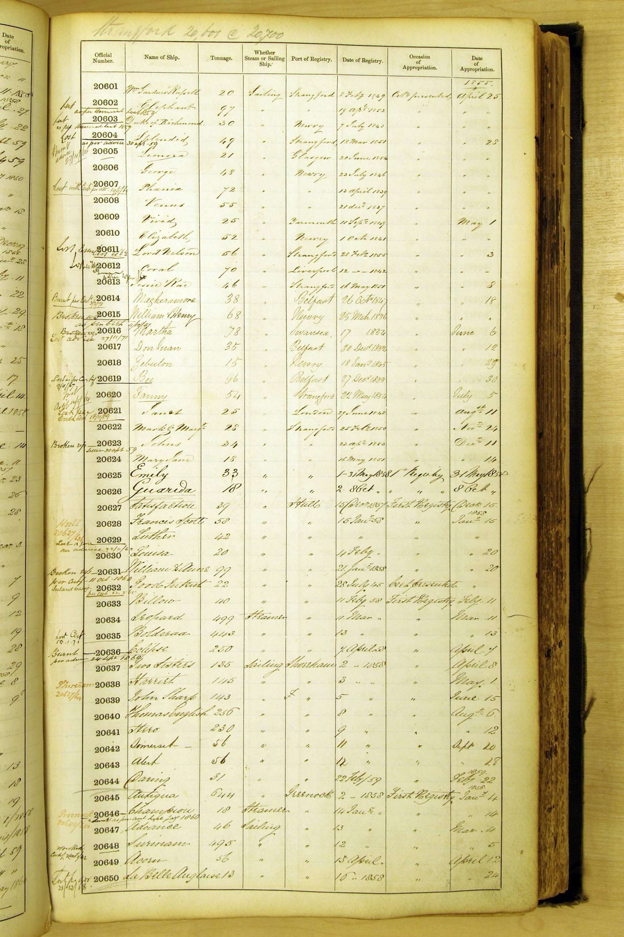 When the system of official numbers began on 16 April 1855, the British Ports of Registry were each allocated batches of official numbers. For official numbers up to 22200 you can see this allocation as a pencil note at the top of the page where the allocation began. A summary of the first allocation is shown here: Initial allocation of official numbers