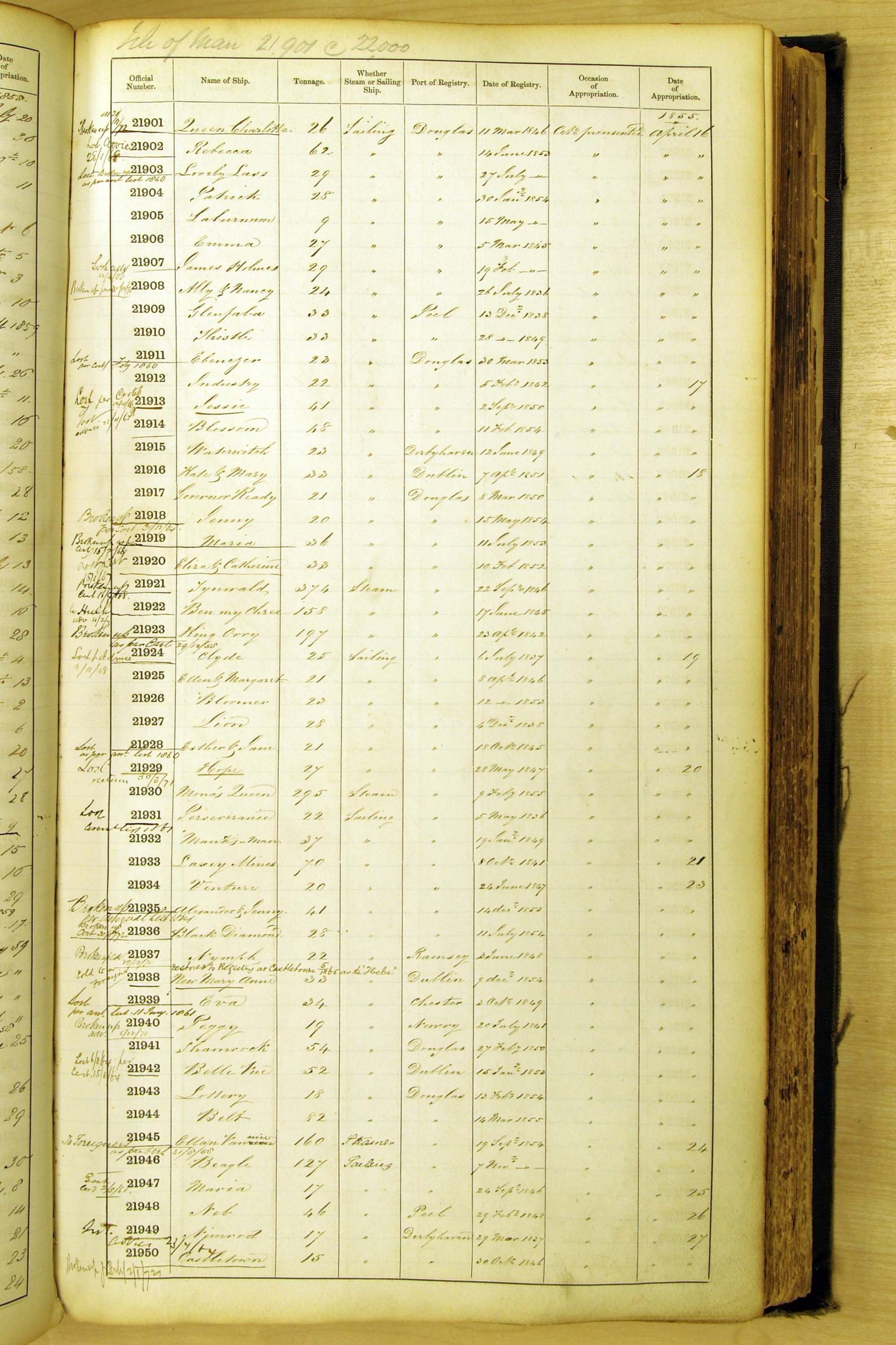 When the system of official numbers began on 16 April 1855, the British Ports of Registry were each allocated batches of official numbers. For official numbers up to 22200 you can see this allocation as a pencil note at the top of the page where the allocation began. A summary of the first allocation is shown here: Initial allocation of official numbers