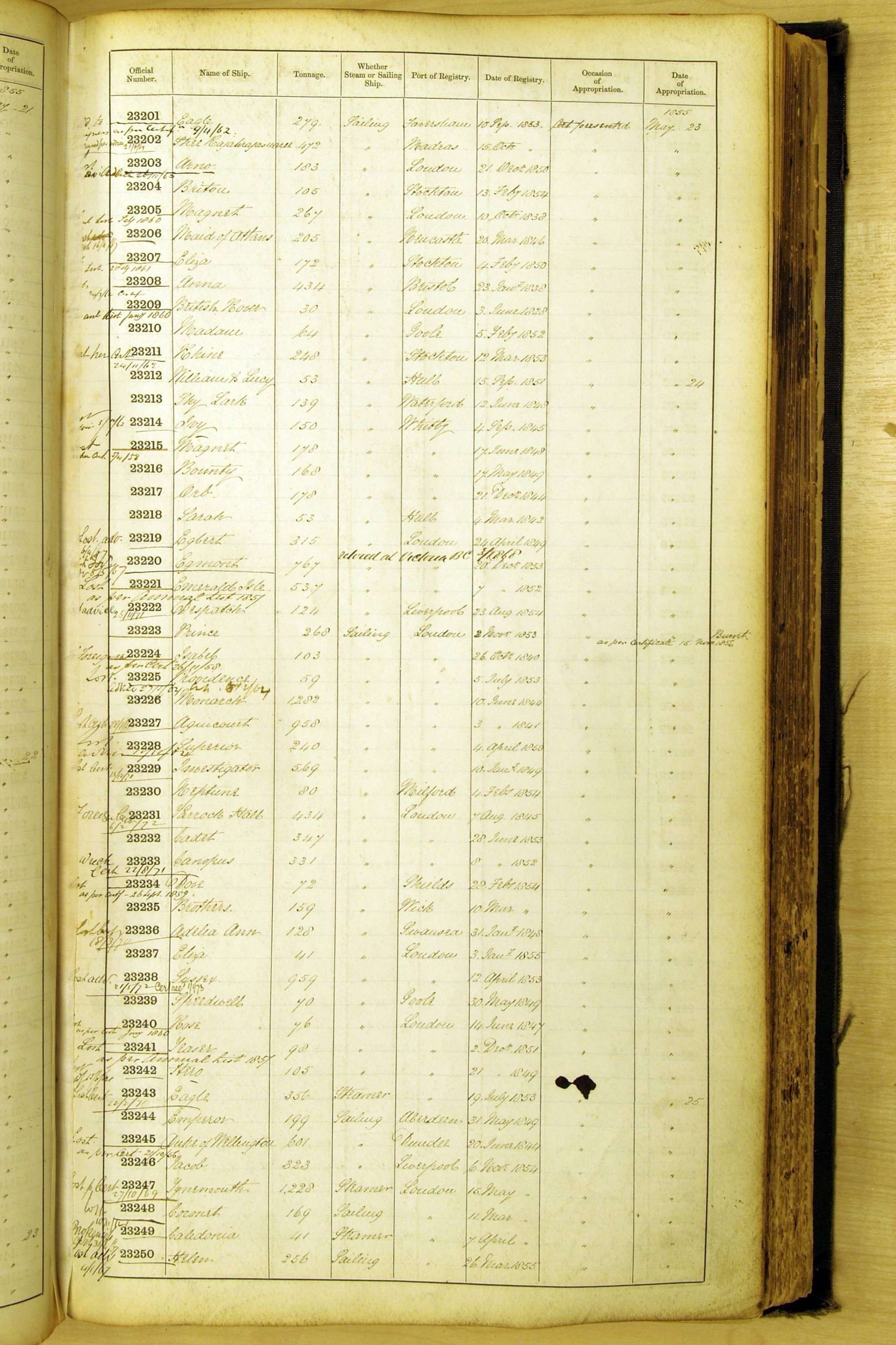 Bear in mind that the ships names in the Appropriation Books are not the definitive name or spelling of the name, even though these are the central records for the whole system. As you can see, the entries are hand-written and derived from hand-written returns made by the various ports, themselves based on the hand-written shipping registers, based on what the port officials thought the person registering the ship was saying or had hand-written down.