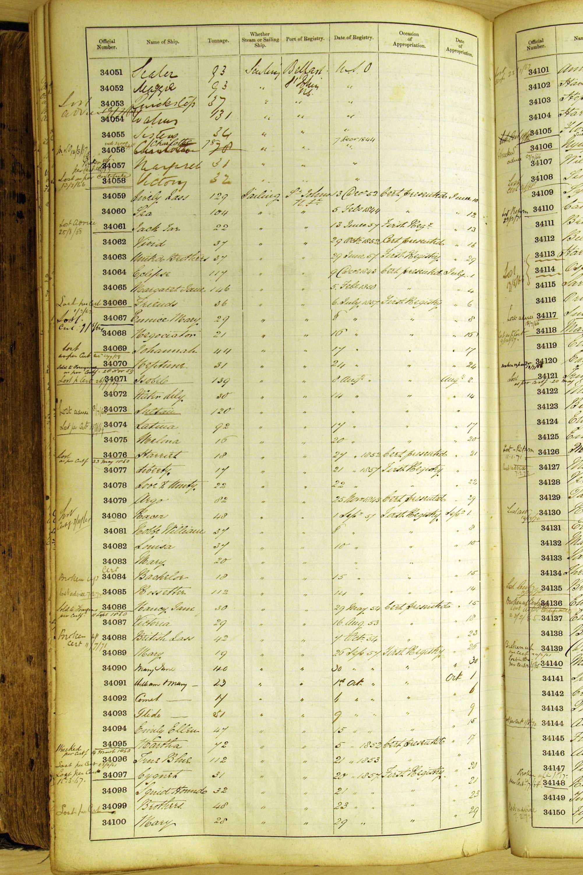 Especially in the first volume, there are frequent margin annotations against the entries which (if you can decipher them) can provide information on the ultimate fate of the ship. Typical entries are 'Lost as per cert[ificate] 20/6/58' or 'Sold foreigners per advice 8/4/67'. Beware - it is sometimes not easy to see which entry it refers to. However, these annotations may be a useful quick alternative to consulting the original Shipping Registers.