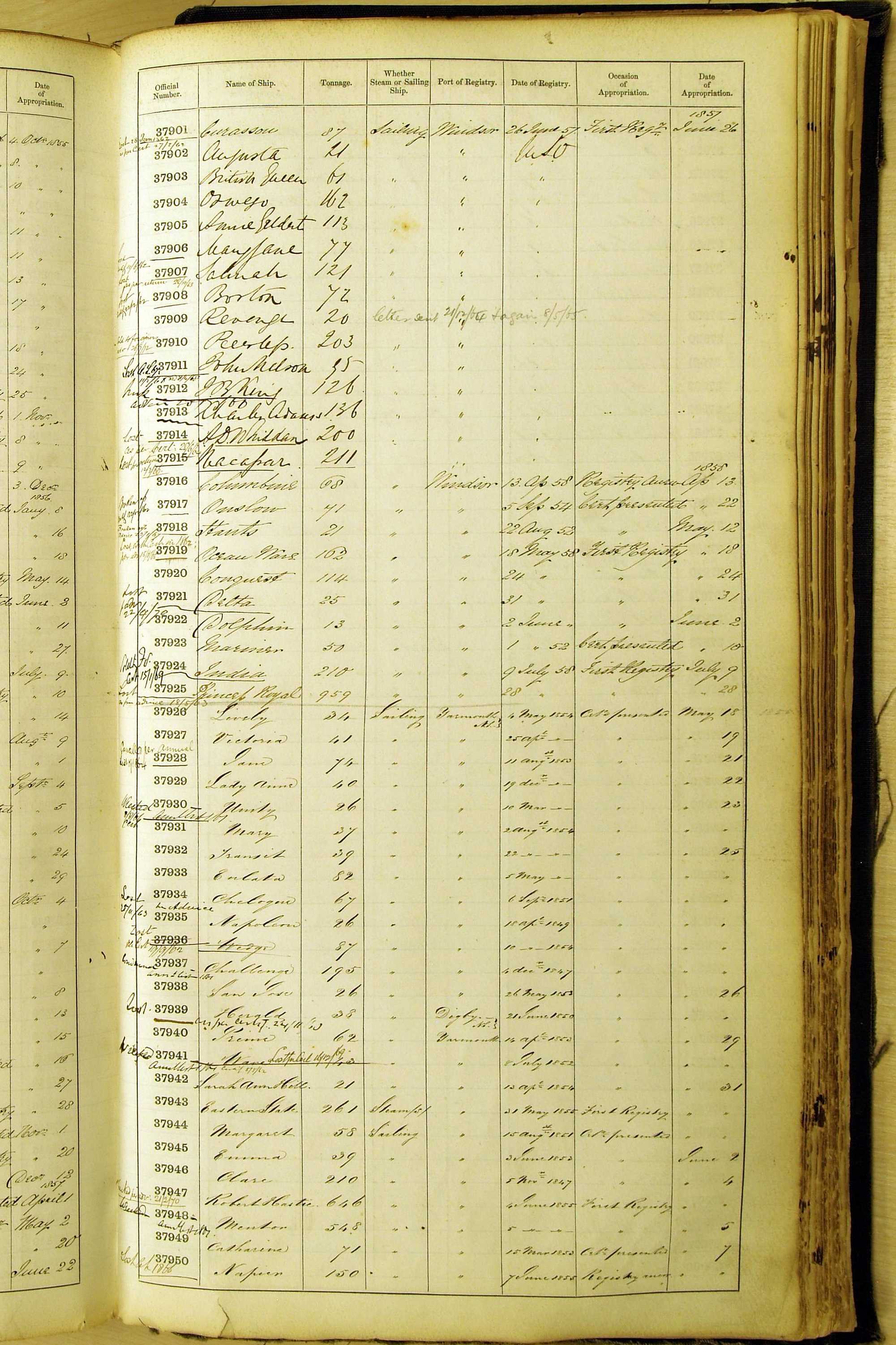 Bear in mind that the ships names in the Appropriation Books are not the definitive name or spelling of the name, even though these are the central records for the whole system. As you can see, the entries are hand-written and derived from hand-written returns made by the various ports, themselves based on the hand-written shipping registers, based on what the port officials thought the person registering the ship was saying or had hand-written down.