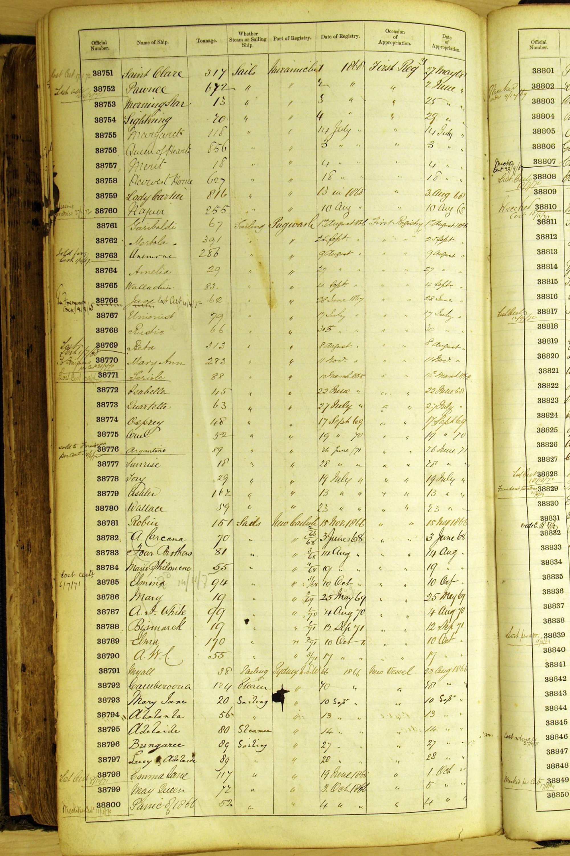Especially in the first volume, there are frequent margin annotations against the entries which (if you can decipher them) can provide information on the ultimate fate of the ship. Typical entries are 'Lost as per cert[ificate] 20/6/58' or 'Sold foreigners per advice 8/4/67'. Beware - it is sometimes not easy to see which entry it refers to. However, these annotations may be a useful quick alternative to consulting the original Shipping Registers.