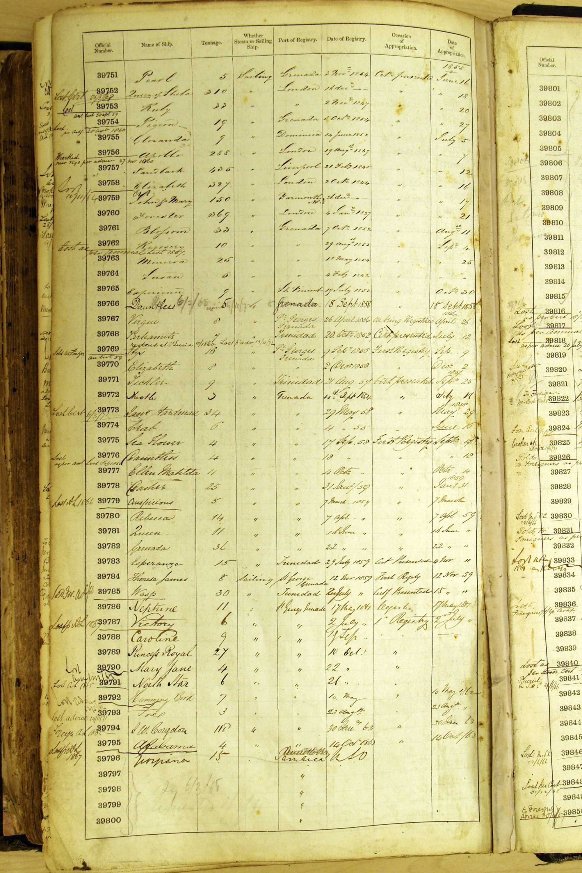 Especially in the first volume, there are frequent margin annotations against the entries which (if you can decipher them) can provide information on the ultimate fate of the ship. Typical entries are 'Lost as per cert[ificate] 20/6/58' or 'Sold foreigners per advice 8/4/67'. Beware - it is sometimes not easy to see which entry it refers to. However, these annotations may be a useful quick alternative to consulting the original Shipping Registers.