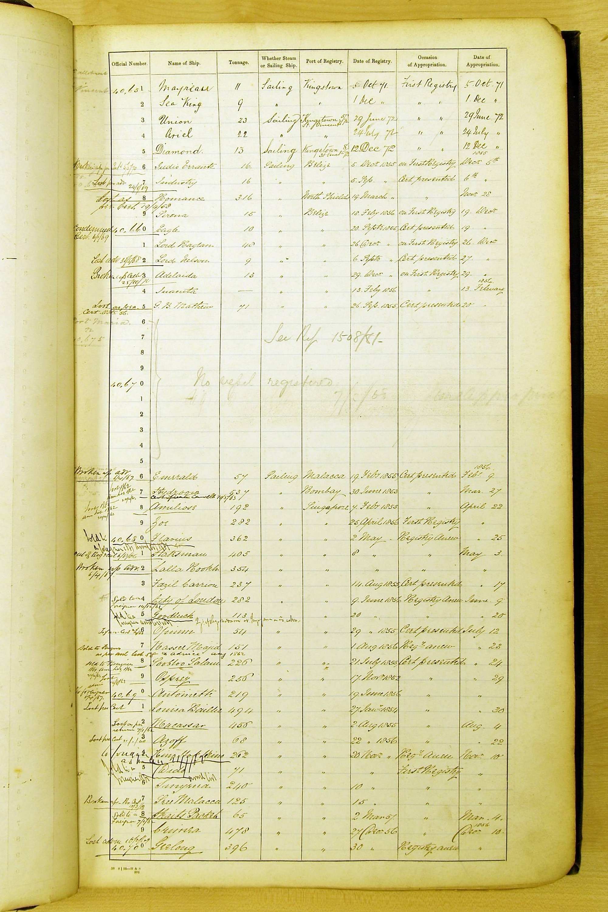 Especially in the first volume, there are frequent margin annotations against the entries which (if you can decipher them) can provide information on the ultimate fate of the ship. Typical entries are 'Lost as per cert[ificate] 20/6/58' or 'Sold foreigners per advice 8/4/67'. Beware - it is sometimes not easy to see which entry it refers to. However, these annotations may be a useful quick alternative to consulting the original Shipping Registers.