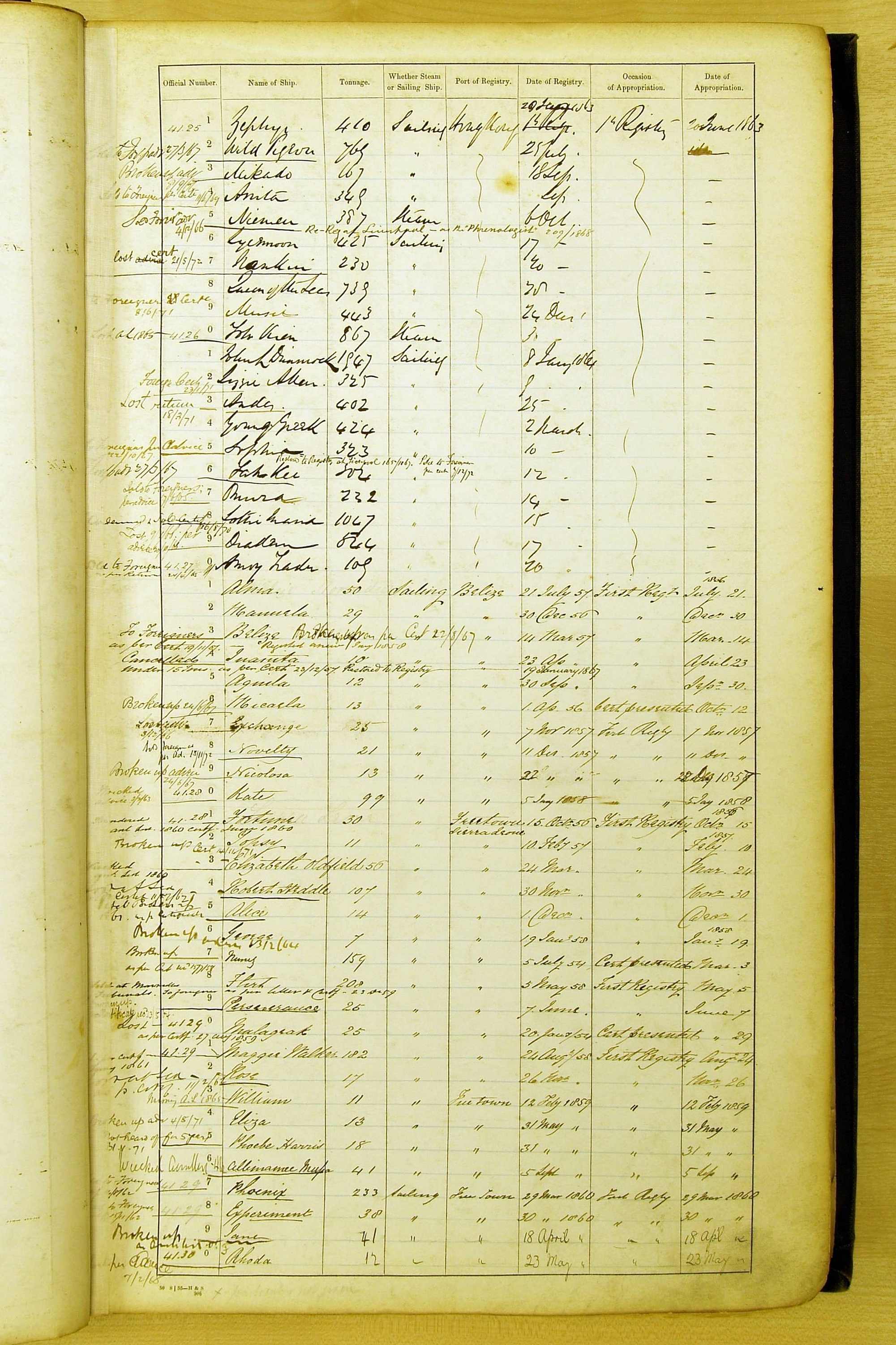 Especially in the first volume, there are frequent margin annotations against the entries which (if you can decipher them) can provide information on the ultimate fate of the ship. Typical entries are 'Lost as per cert[ificate] 20/6/58' or 'Sold foreigners per advice 8/4/67'. Beware - it is sometimes not easy to see which entry it refers to. However, these annotations may be a useful quick alternative to consulting the original Shipping Registers.