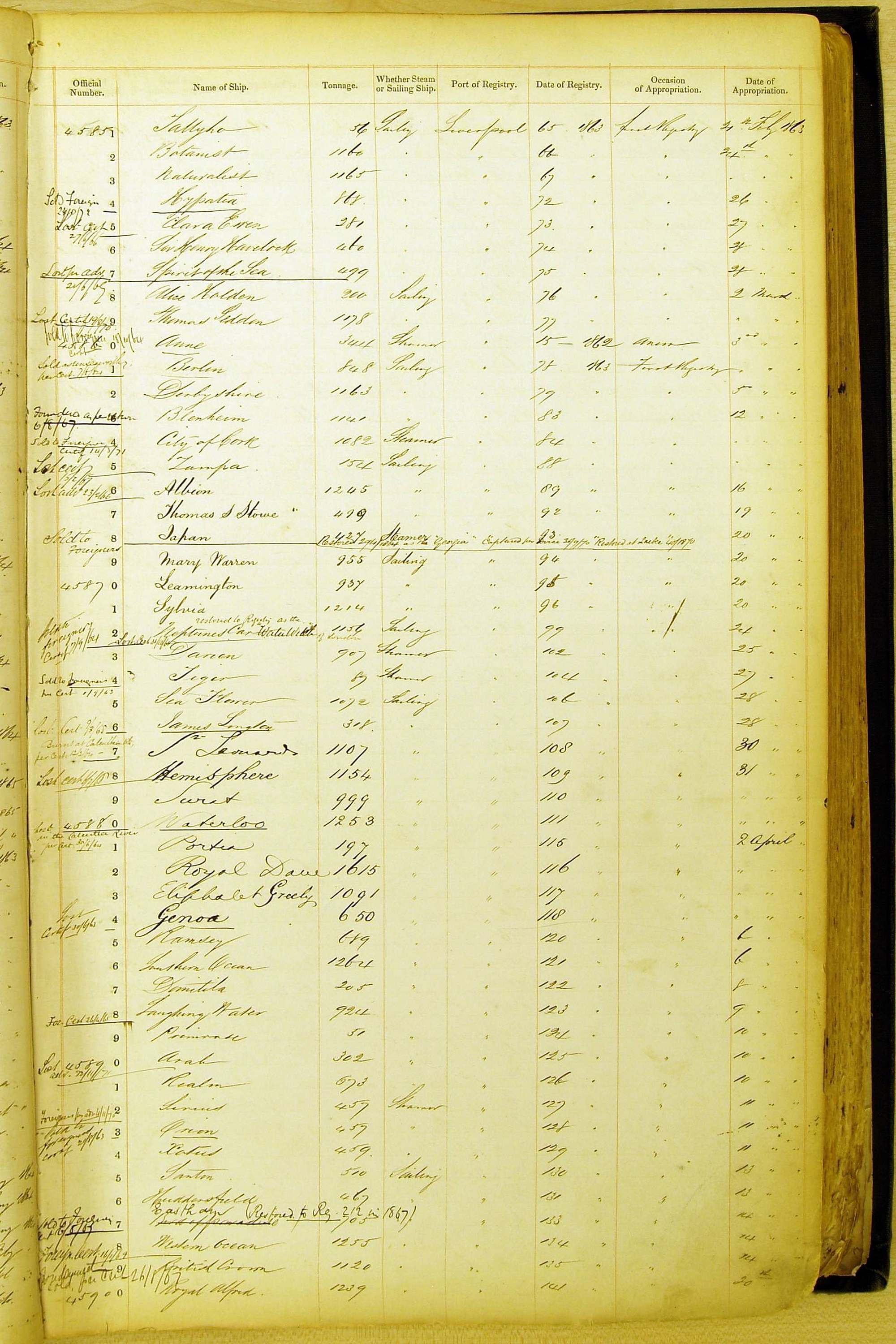 Especially in the first volume, there are frequent margin annotations against the entries which (if you can decipher them) can provide information on the ultimate fate of the ship. Typical entries are 'Lost as per cert[ificate] 20/6/58' or 'Sold foreigners per advice 8/4/67'. Beware - it is sometimes not easy to see which entry it refers to. However, these annotations may be a useful quick alternative to consulting the original Shipping Registers.