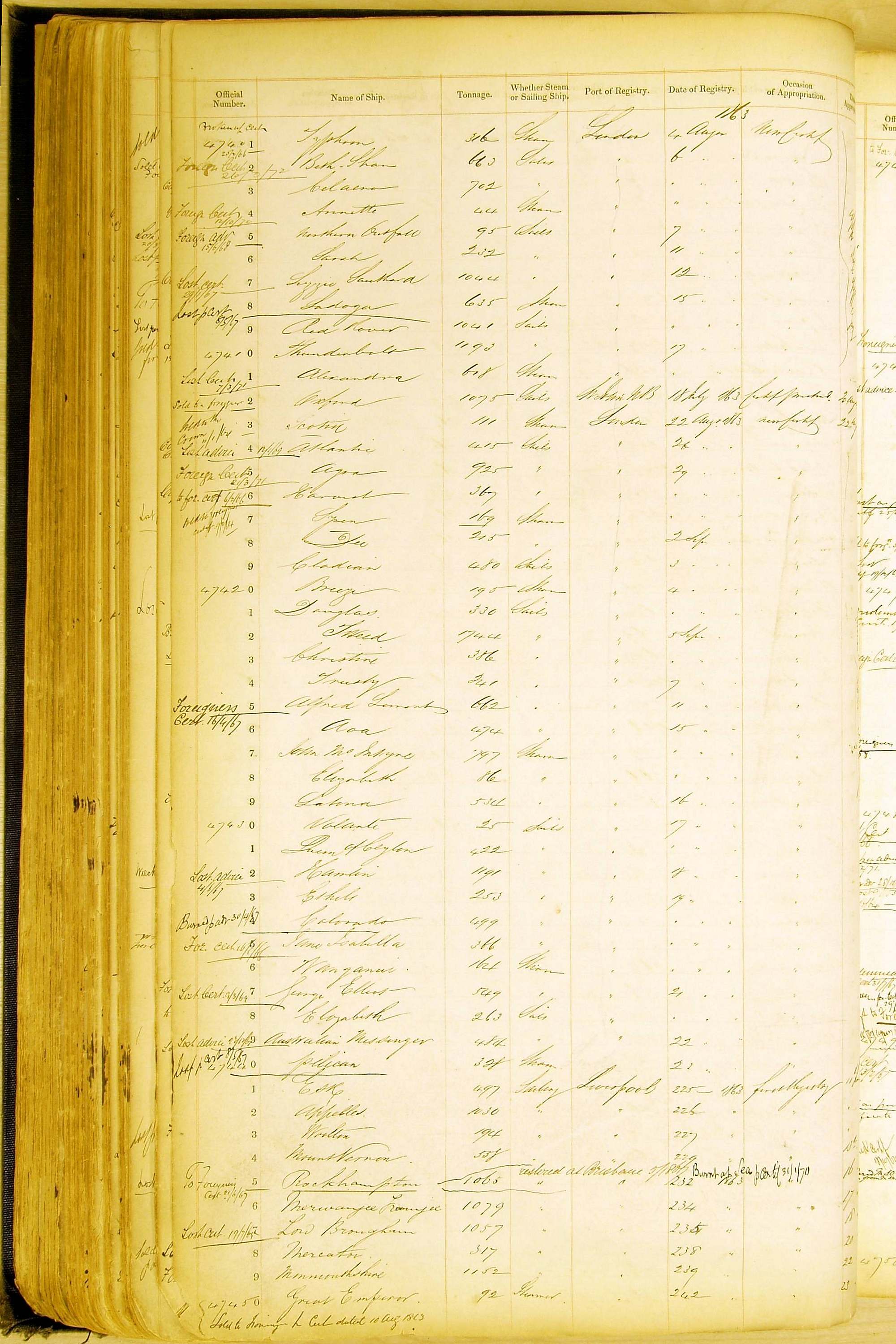 Especially in the first volume, there are frequent margin annotations against the entries which (if you can decipher them) can provide information on the ultimate fate of the ship. Typical entries are 'Lost as per cert[ificate] 20/6/58' or 'Sold foreigners per advice 8/4/67'. Beware - it is sometimes not easy to see which entry it refers to. However, these annotations may be a useful quick alternative to consulting the original Shipping Registers.