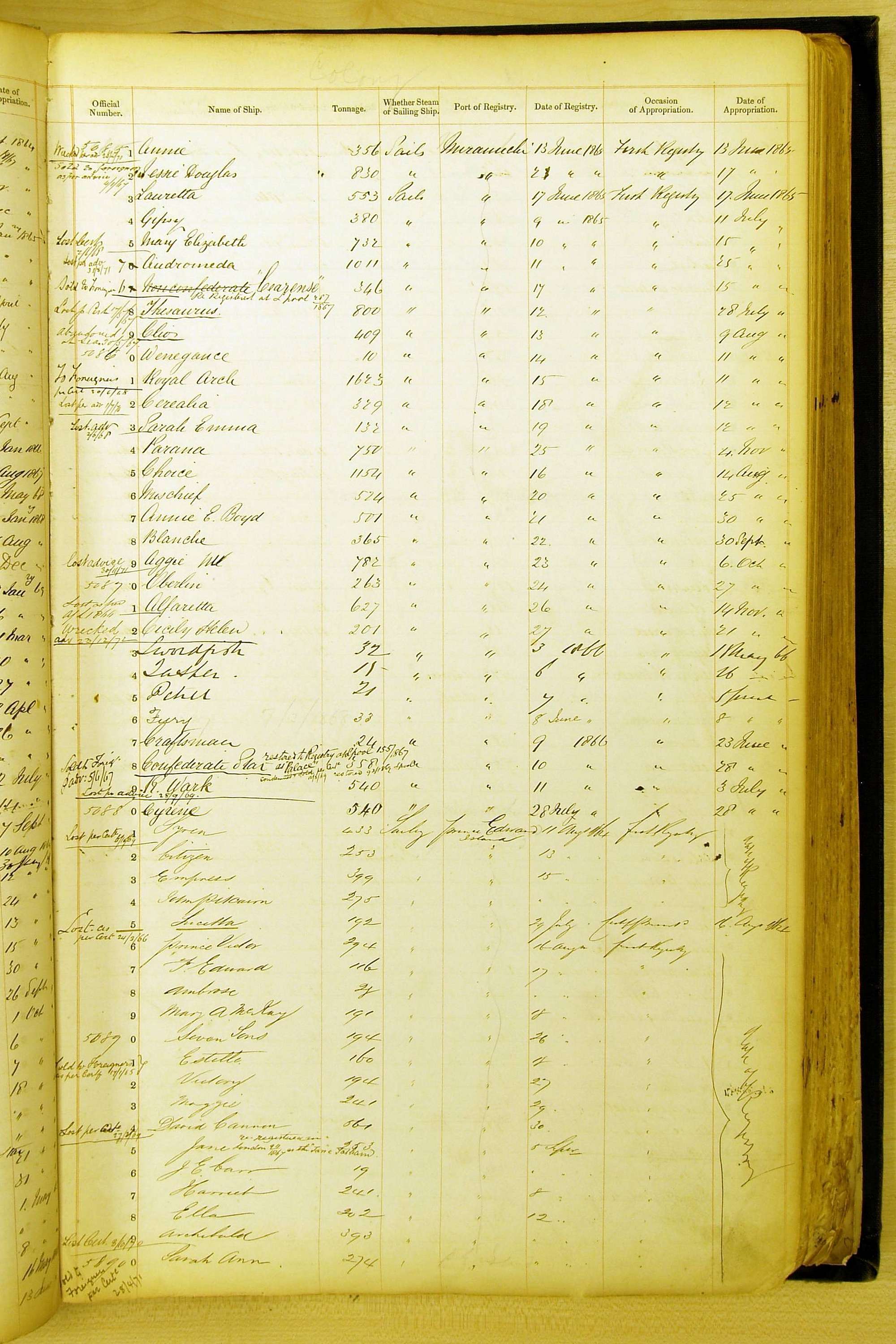 Especially in the first volume, there are frequent margin annotations against the entries which (if you can decipher them) can provide information on the ultimate fate of the ship. Typical entries are 'Lost as per cert[ificate] 20/6/58' or 'Sold foreigners per advice 8/4/67'. Beware - it is sometimes not easy to see which entry it refers to. However, these annotations may be a useful quick alternative to consulting the original Shipping Registers.