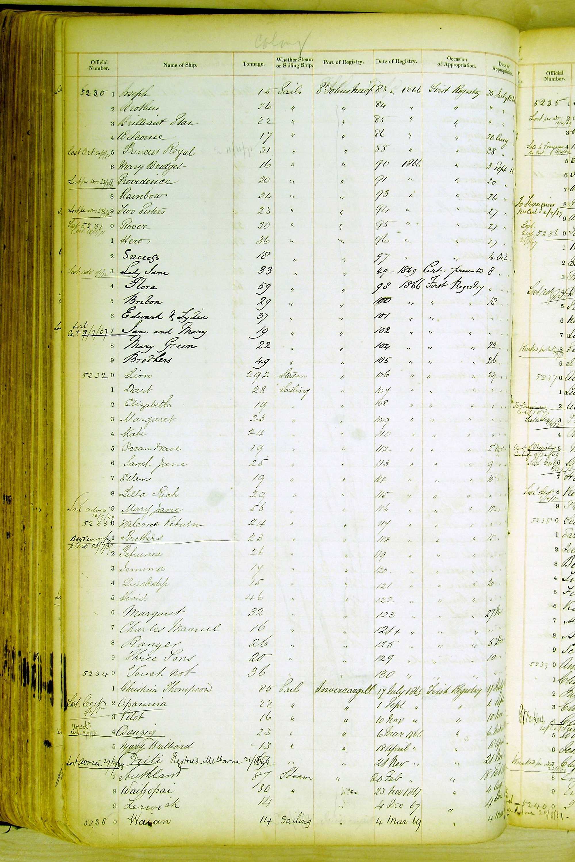 Especially in the first volume, there are frequent margin annotations against the entries which (if you can decipher them) can provide information on the ultimate fate of the ship. Typical entries are 'Lost as per cert[ificate] 20/6/58' or 'Sold foreigners per advice 8/4/67'. Beware - it is sometimes not easy to see which entry it refers to. However, these annotations may be a useful quick alternative to consulting the original Shipping Registers.