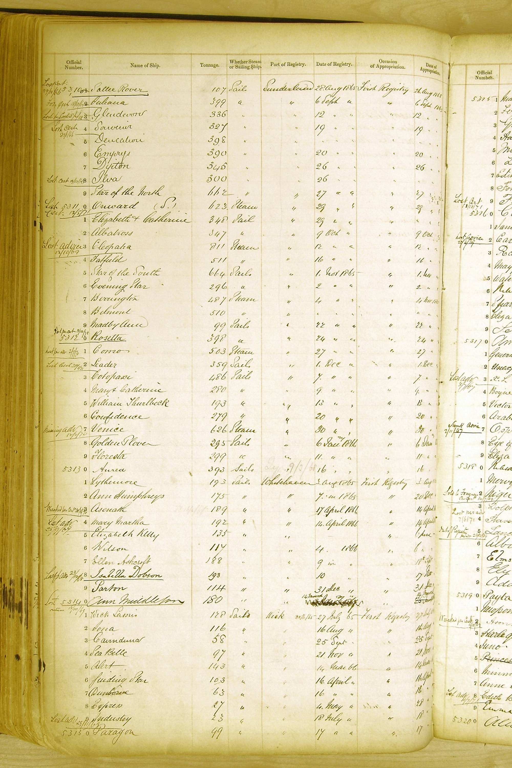 Especially in the first volume, there are frequent margin annotations against the entries which (if you can decipher them) can provide information on the ultimate fate of the ship. Typical entries are 'Lost as per cert[ificate] 20/6/58' or 'Sold foreigners per advice 8/4/67'. Beware - it is sometimes not easy to see which entry it refers to. However, these annotations may be a useful quick alternative to consulting the original Shipping Registers.