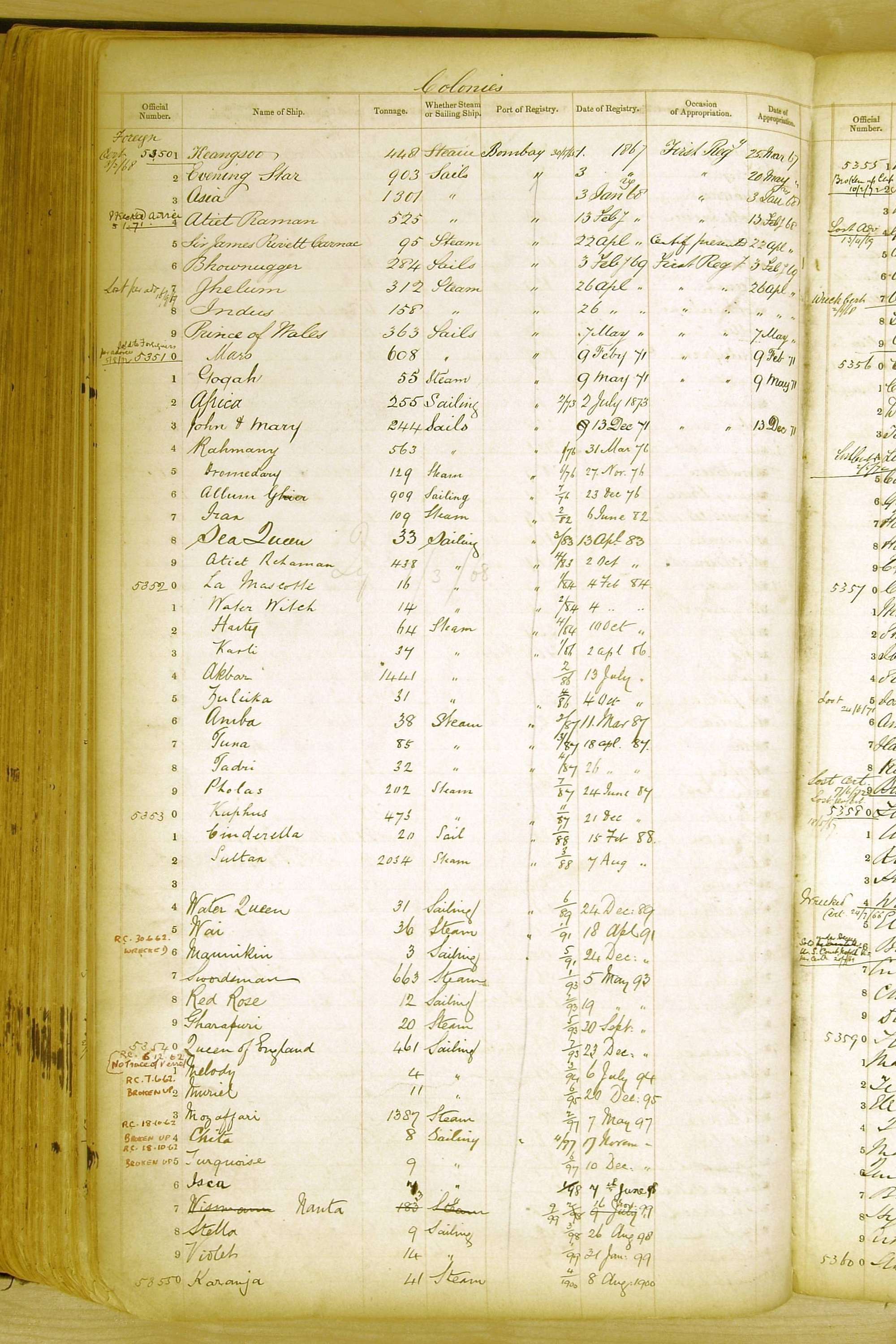 Especially in the first volume, there are frequent margin annotations against the entries which (if you can decipher them) can provide information on the ultimate fate of the ship. Typical entries are 'Lost as per cert[ificate] 20/6/58' or 'Sold foreigners per advice 8/4/67'. Beware - it is sometimes not easy to see which entry it refers to. However, these annotations may be a useful quick alternative to consulting the original Shipping Registers.