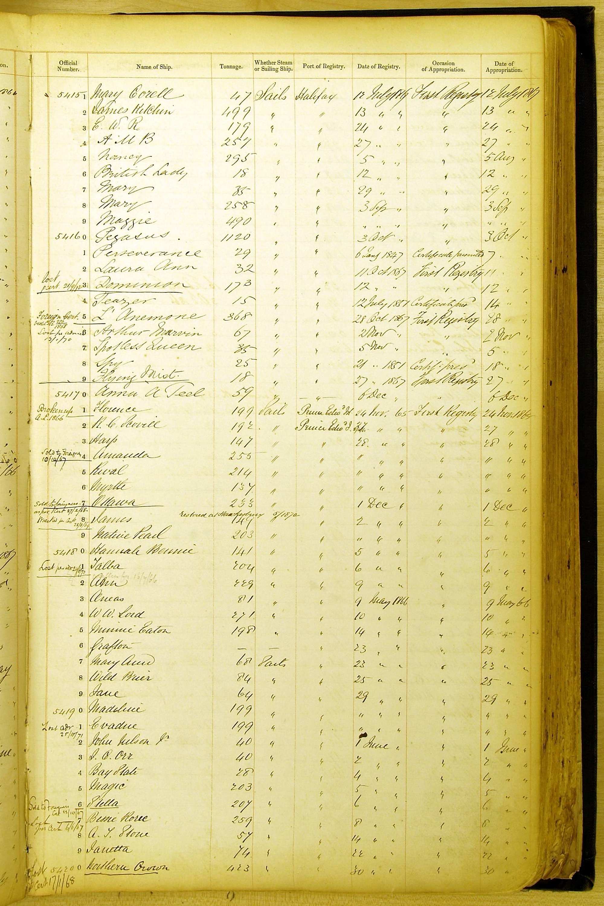Especially in the first volume, there are frequent margin annotations against the entries which (if you can decipher them) can provide information on the ultimate fate of the ship. Typical entries are 'Lost as per cert[ificate] 20/6/58' or 'Sold foreigners per advice 8/4/67'. Beware - it is sometimes not easy to see which entry it refers to. However, these annotations may be a useful quick alternative to consulting the original Shipping Registers.