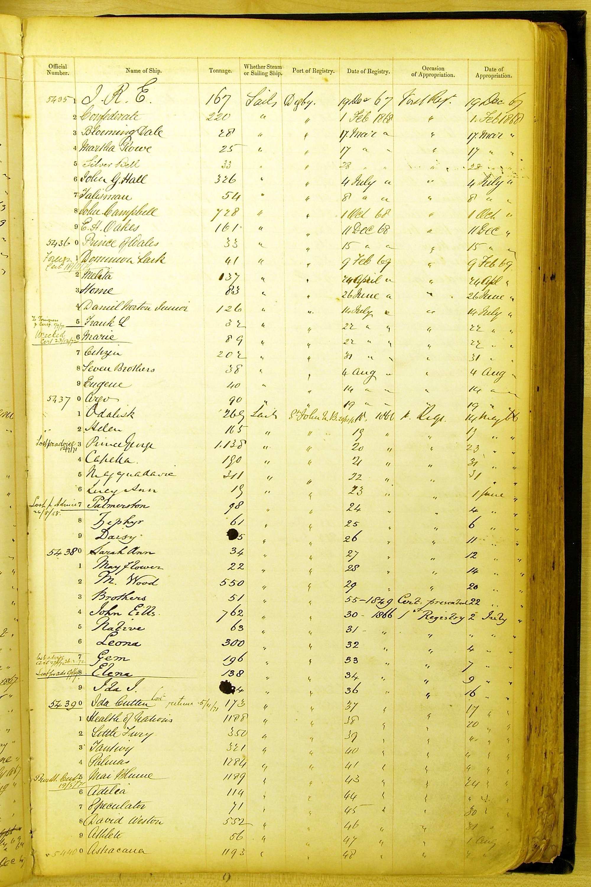 Especially in the first volume, there are frequent margin annotations against the entries which (if you can decipher them) can provide information on the ultimate fate of the ship. Typical entries are 'Lost as per cert[ificate] 20/6/58' or 'Sold foreigners per advice 8/4/67'. Beware - it is sometimes not easy to see which entry it refers to. However, these annotations may be a useful quick alternative to consulting the original Shipping Registers.