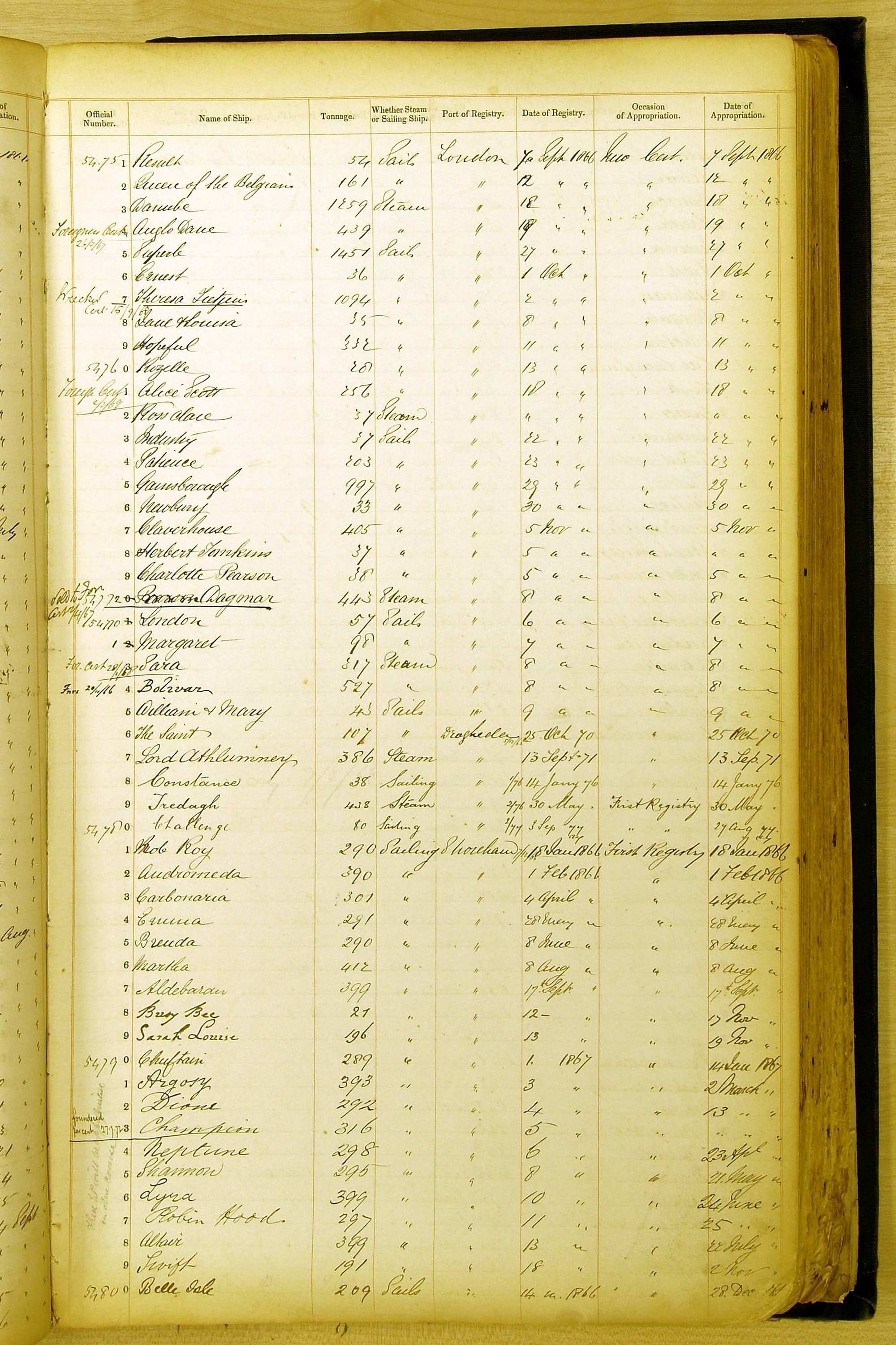 Especially in the first volume, there are frequent margin annotations against the entries which (if you can decipher them) can provide information on the ultimate fate of the ship. Typical entries are 'Lost as per cert[ificate] 20/6/58' or 'Sold foreigners per advice 8/4/67'. Beware - it is sometimes not easy to see which entry it refers to. However, these annotations may be a useful quick alternative to consulting the original Shipping Registers.
