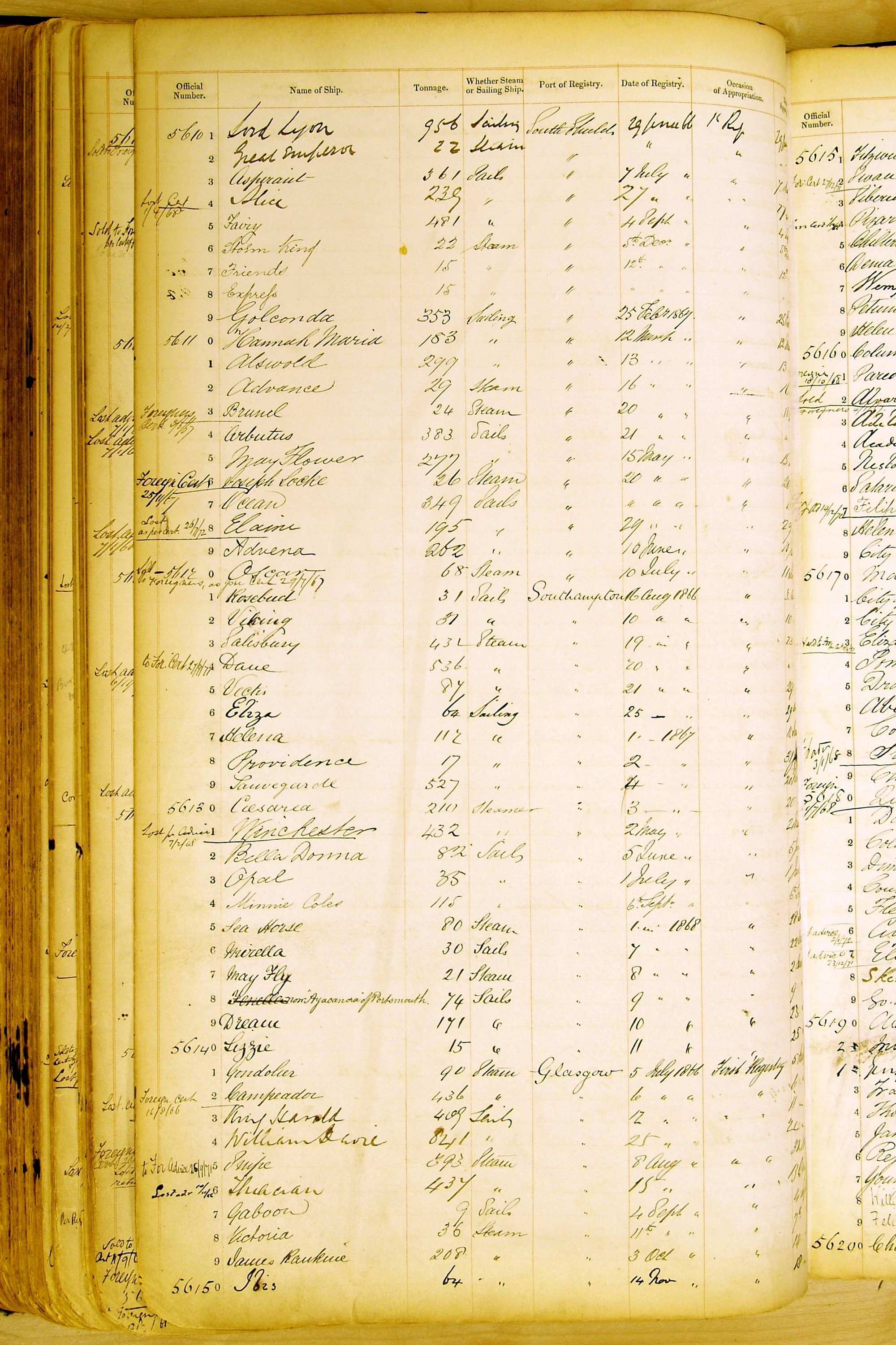 Especially in the first volume, there are frequent margin annotations against the entries which (if you can decipher them) can provide information on the ultimate fate of the ship. Typical entries are 'Lost as per cert[ificate] 20/6/58' or 'Sold foreigners per advice 8/4/67'. Beware - it is sometimes not easy to see which entry it refers to. However, these annotations may be a useful quick alternative to consulting the original Shipping Registers.