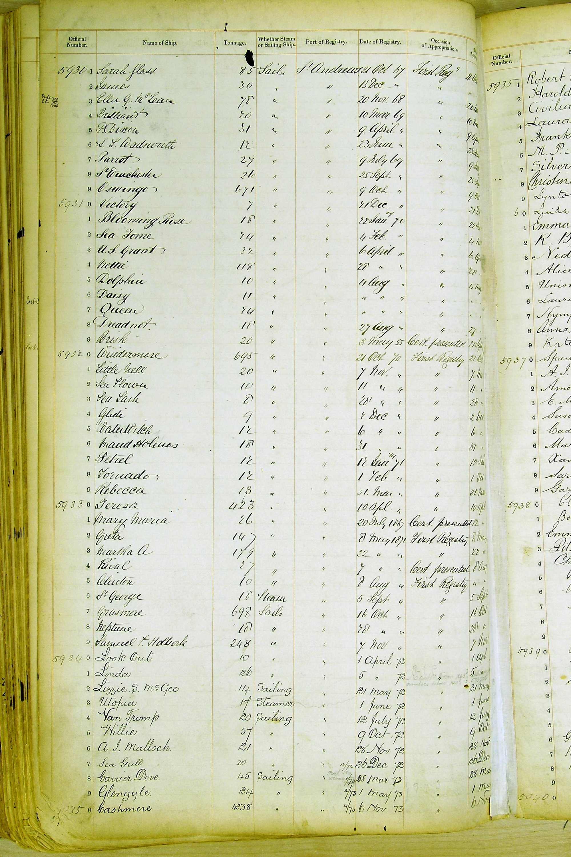 The ship names recorded are those that the ships carried at the time that their official numbers were allocated - changes are sometimes noted, but the best source for changes of name are the shipping registers for the port, or alternatively the Mercantile Navy List.