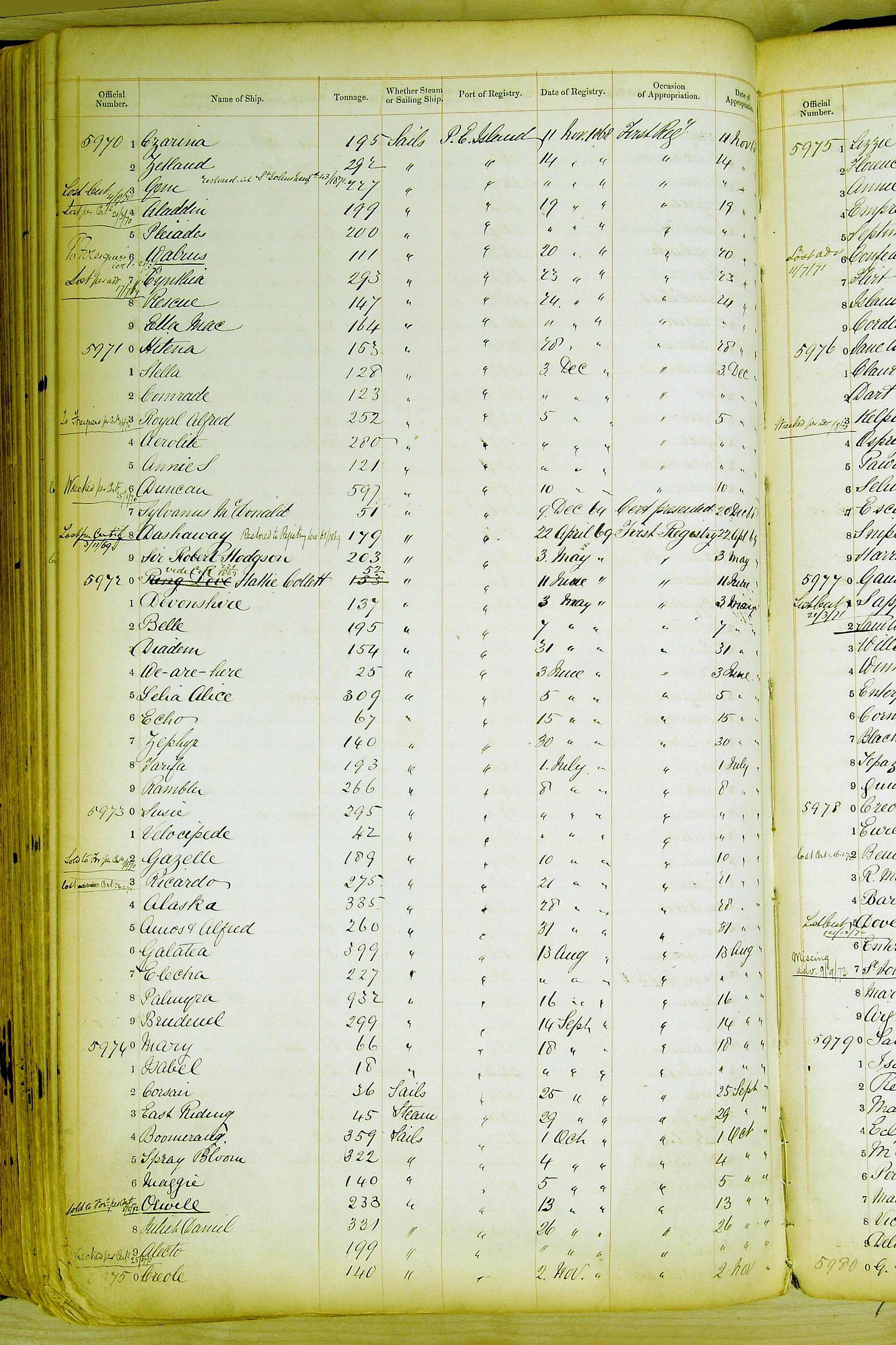 Especially in the first volume, there are frequent margin annotations against the entries which (if you can decipher them) can provide information on the ultimate fate of the ship. Typical entries are 'Lost as per cert[ificate] 20/6/58' or 'Sold foreigners per advice 8/4/67'. Beware - it is sometimes not easy to see which entry it refers to. However, these annotations may be a useful quick alternative to consulting the original Shipping Registers.