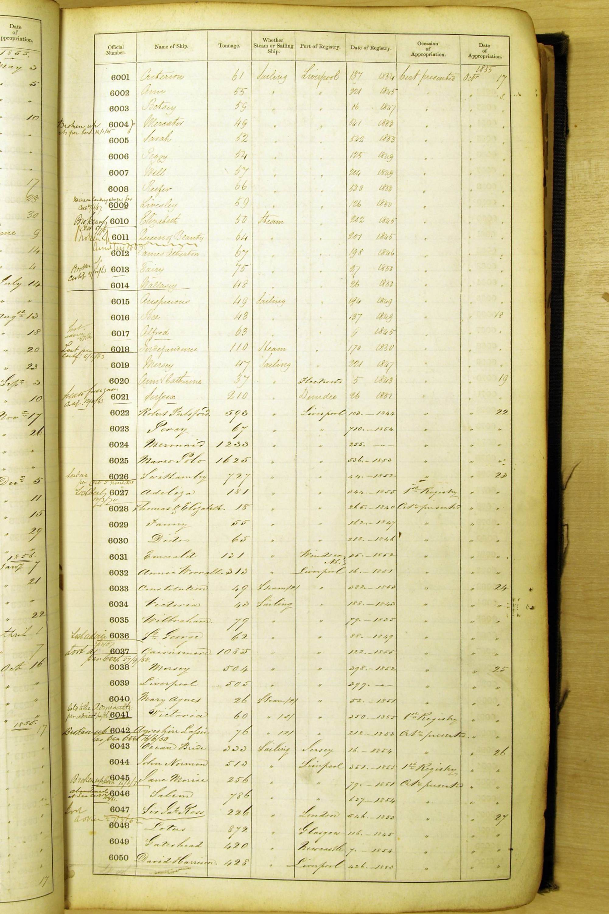 Bear in mind that the ships names in the Appropriation Books are not the definitive name or spelling of the name, even though these are the central records for the whole system. As you can see, the entries are hand-written and derived from hand-written returns made by the various ports, themselves based on the hand-written shipping registers, based on what the port officials thought the person registering the ship was saying or had hand-written down.