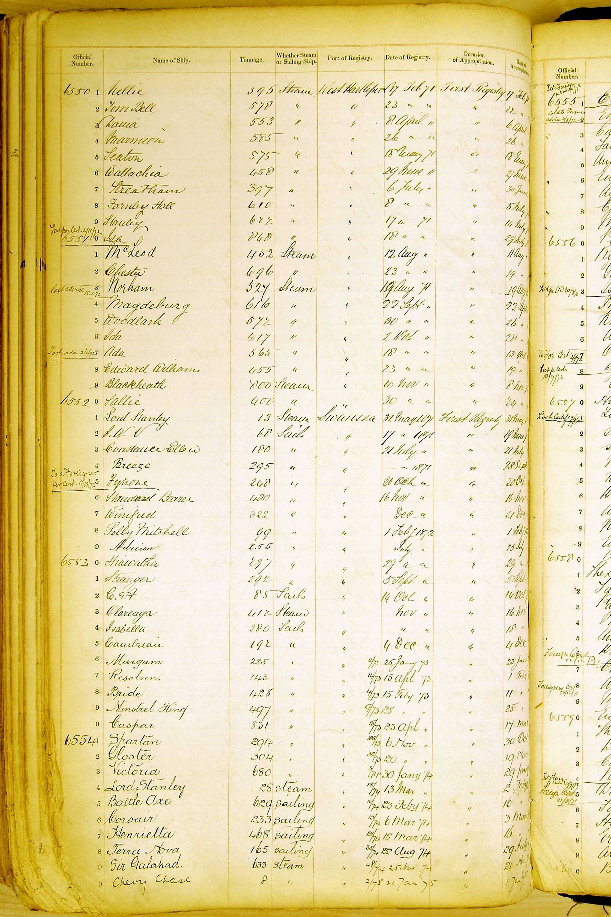 The ship names recorded are those that the ships carried at the time that their official numbers were allocated - changes are sometimes noted, but the best source for changes of name are the shipping registers for the port, or alternatively the Mercantile Navy List.