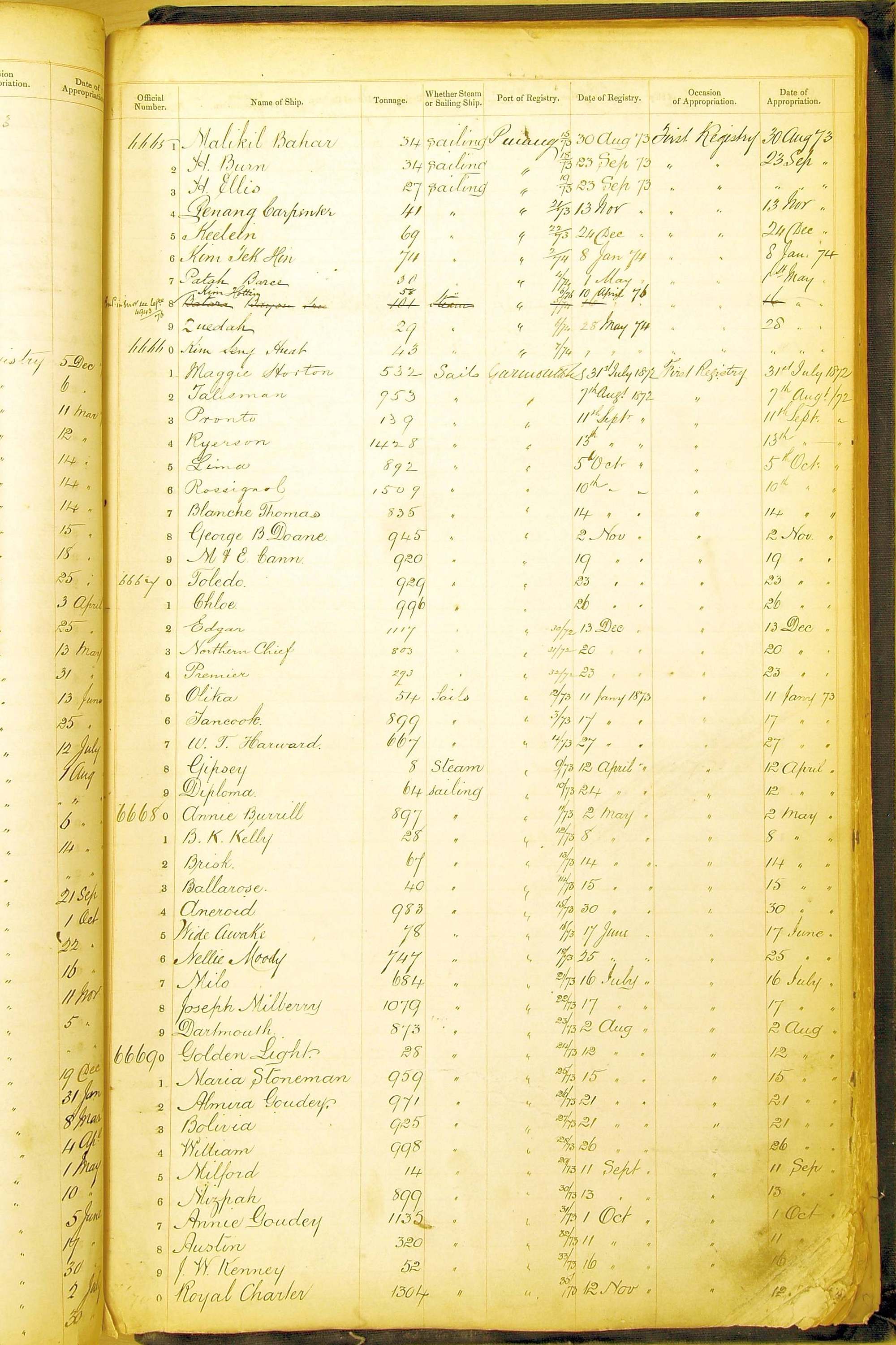 The ship names recorded are those that the ships carried at the time that their official numbers were allocated - changes are sometimes noted, but the best source for changes of name are the shipping registers for the port, or alternatively the Mercantile Navy List.