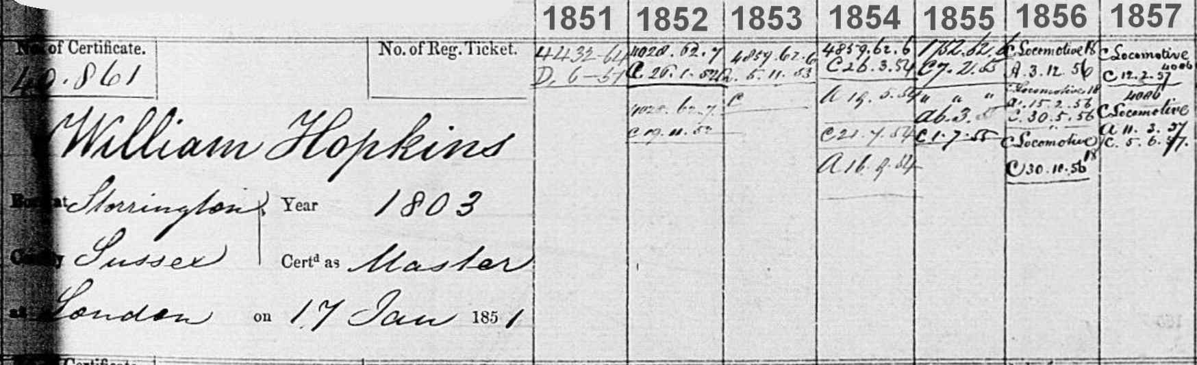Figure 4 shows part of the record of voyages for William Hopkins in BT 124 (the register of masters and mates who were granted certificates in respect of long service).